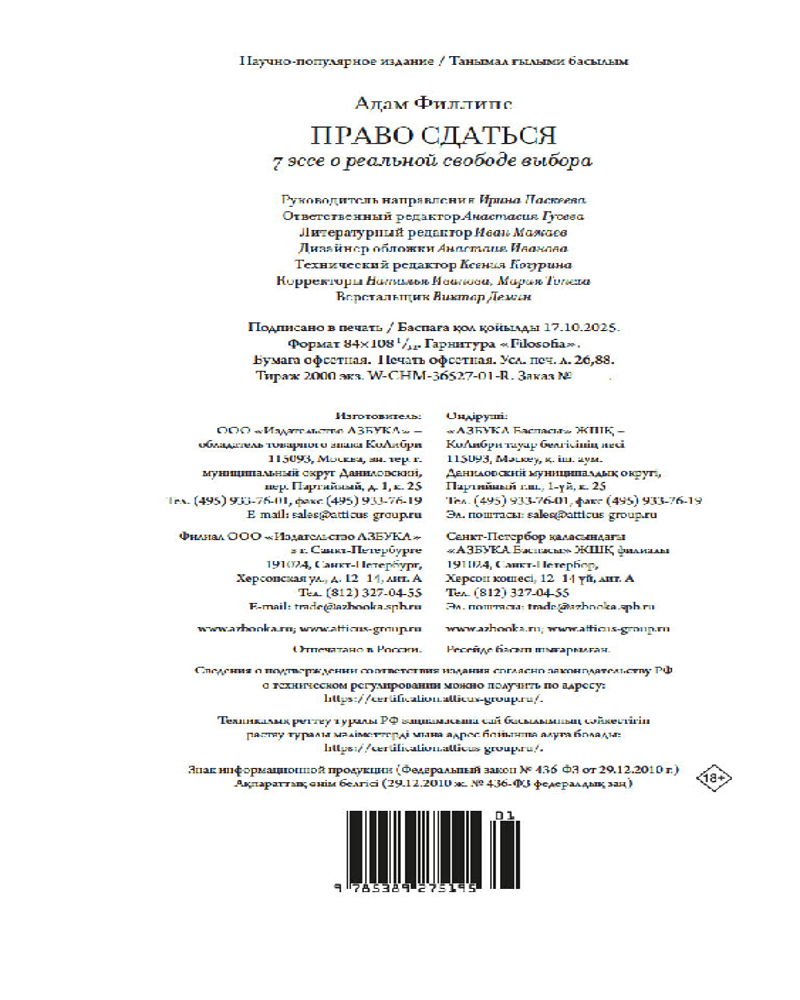 💳 Оплатить за товар можно при получении 🇰🇿 Есть бесплатная доставка по Казахстану от 1 дня 🎁 Копите бонусы с каждой покупки Серия: Человек Мыслящий. Идеи, способные изменить мир Сдаваться или не сдаваться — в чем на самом деле вопрос? Общество твердит нам: «Никогда не сдавайся!». Но что, если именно это упрямство заставляет нас бесконечно катить бесполезный камень на свою гору, подобно Сизифу? В чем разница между здоровой настойчивостью и разрушительным самообманом? Как отказ от иллюзий, токсичных отношений или невротических привязанностей может стать актом освобождения, а не поражения? |