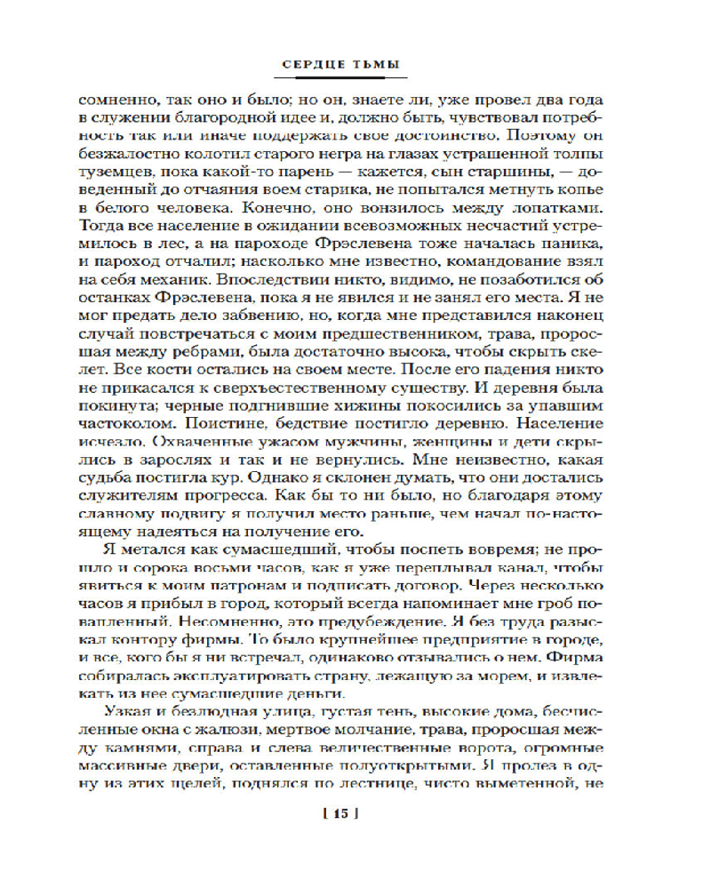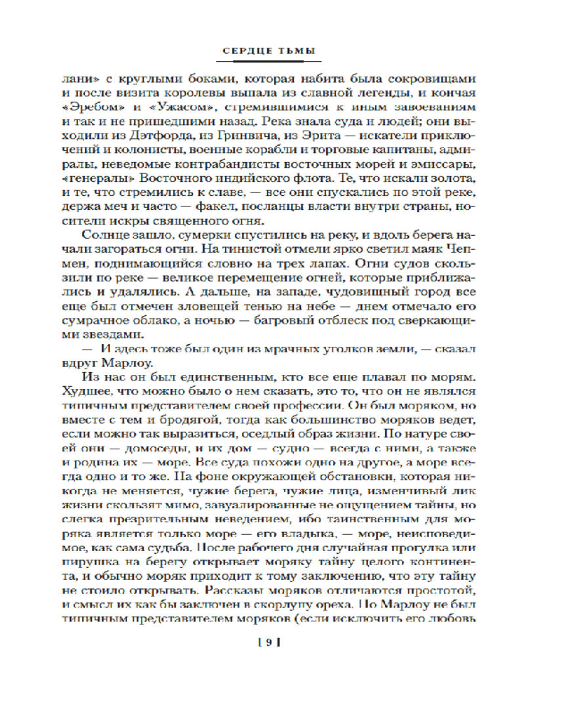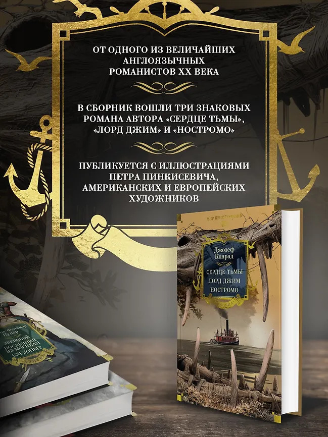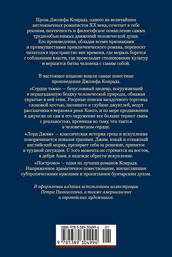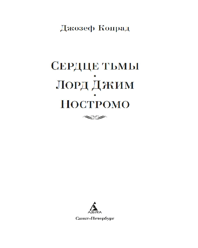 «Сердце тьмы»— безусловный шедевр, погружающий в неразгаданную бездну человеческой природы, обнажая скрытые в ней тени. Упорные поиски загадочного торговца слоновой костью, засевшего в глубине джунглей, ведут рассказчика в верховья реки Конго, и по мере продвижения в джунгли, он сам и его окружение всё больше теряют связь с реальностью, проникая во тьму, что таится в человеческом сердце. «Лорд Джим» — классическая история греха и искупления поворачивается новыми гранями. Джим, юный и отважный английский моряк, презирает себя за решение, принятое в трудный момент. С тех пор он неудержимо стремится на восток, в дебри Азии, в надежде обрести искупление. «Ностромо» — один из лучших романов Конрада. Напряженное, драматичное повествование, впечатляющее субтропическими красками и пропитанное бунтарским духом.