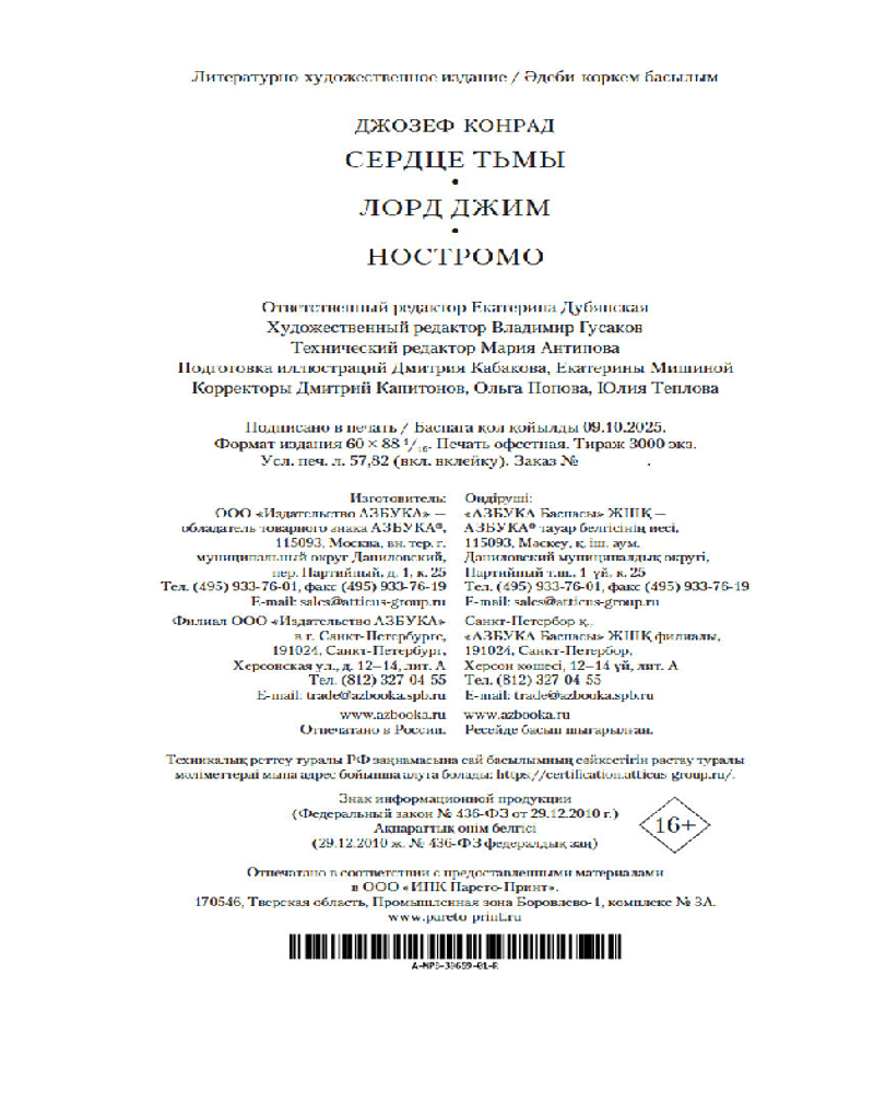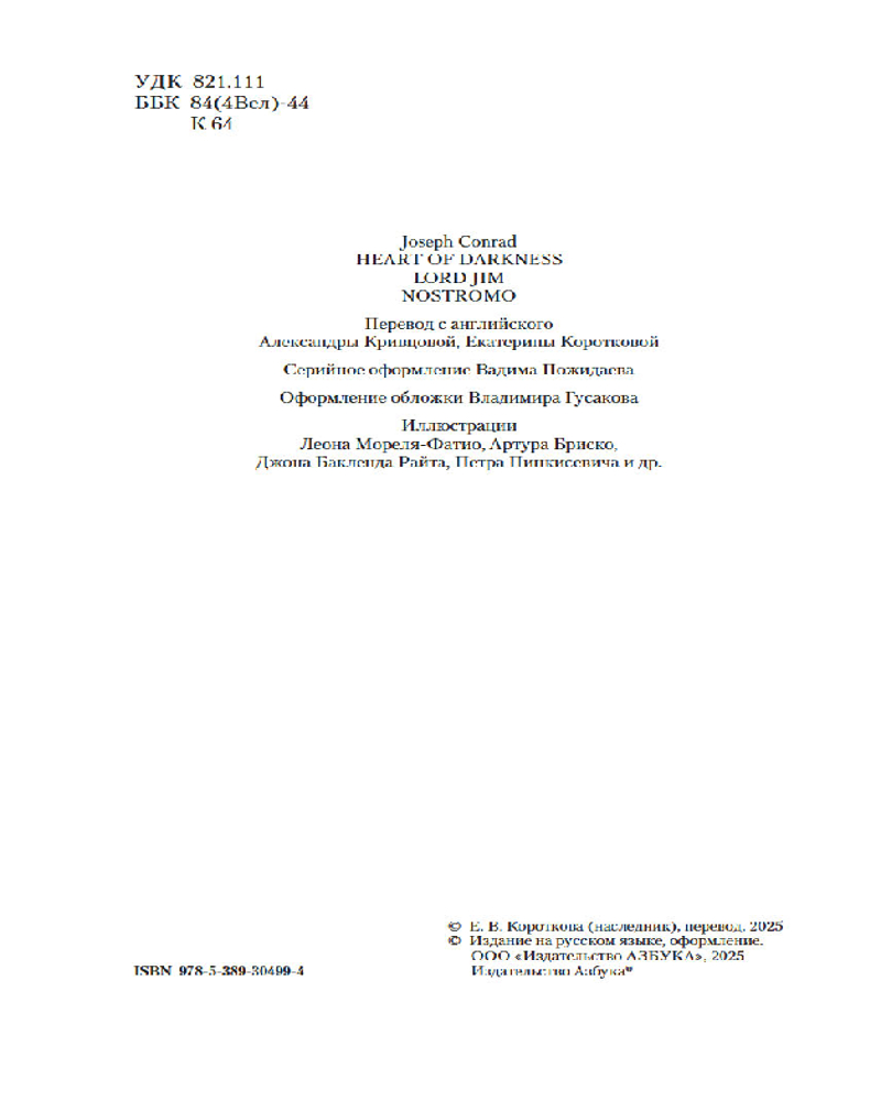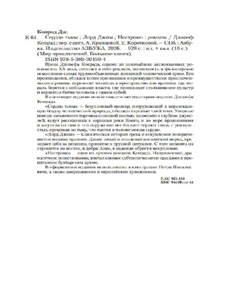 Серия: Мир приключений. Большие книги «Сердце тьмы», «Лорд Джим», «Ностромо» — три лучших произведения Джозефа Конрада, одного из величайших англоязычных романистов XX века, чья проза сочетает в себе реализм, поэтичность и философское осмысление самых труднообъяснимых движений человеческой души. Его произведения, обладая всеми признаками и преимуществами приключенческого романа, переносят читателя в пространство вне времени, где мораль борется с соблазнами власти, где происходит столкновение культур и вершится битва человека с самим собой.