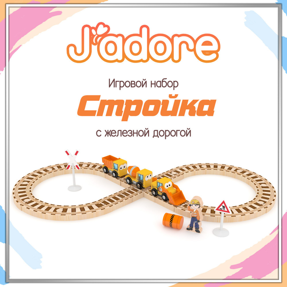 В набор входит игрушечная железная дорога, складывающаяся в "восьмёрку", фигурка строителя, игровые аксессуары и 3 машинки, которые выглядят как забавные элементы строительной техники: погрузчик, самосвал и автобетоносмеситель. Со всеми этими деталями можно придумать множество интересных сюжетов и историй.