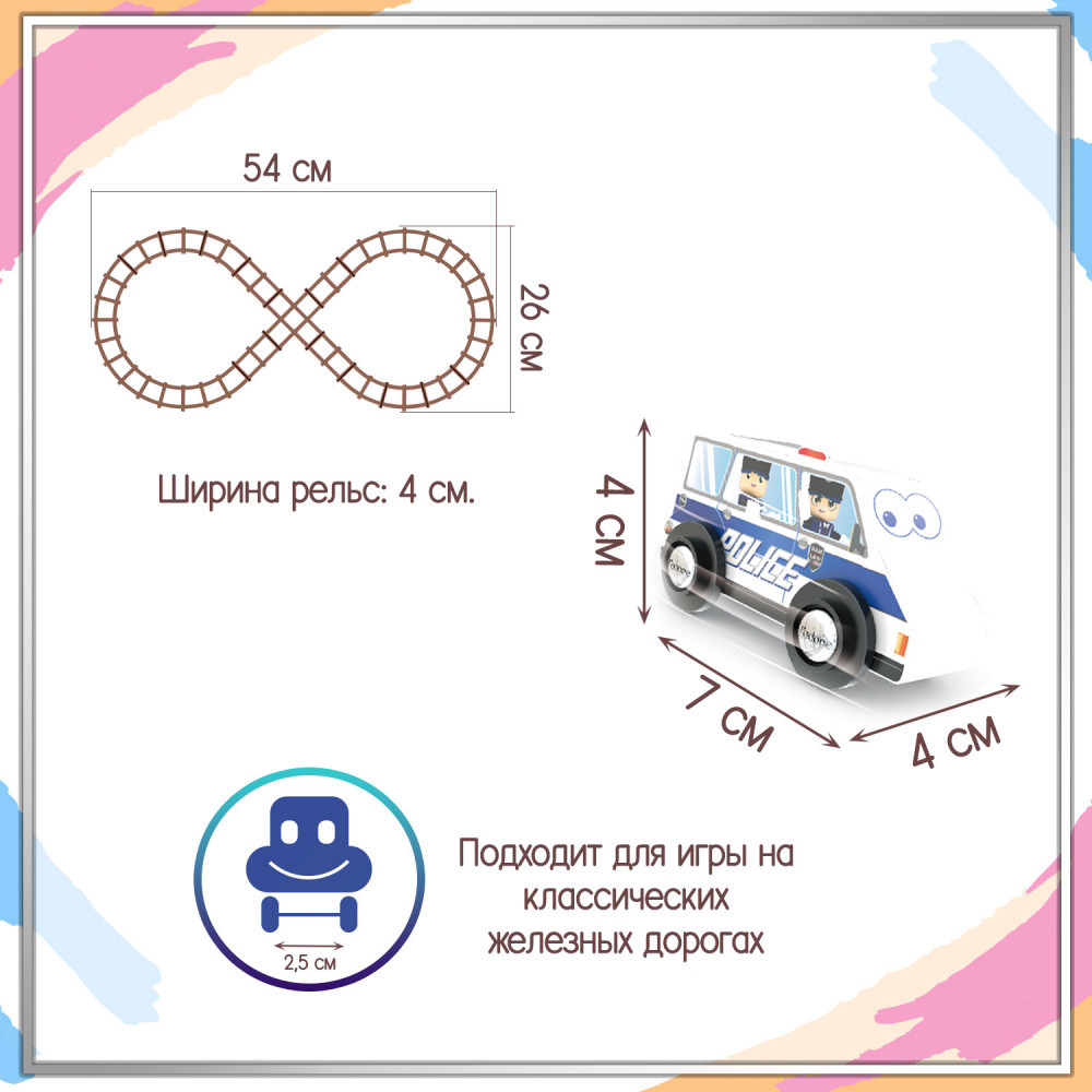 • комплектация: деревянная железная дорога «восьмёрка», три полицейские машины (внедорожник, вертолёт и фургон), фигурка полицейского, фигурка собаки, дорожный знак и светофор;
