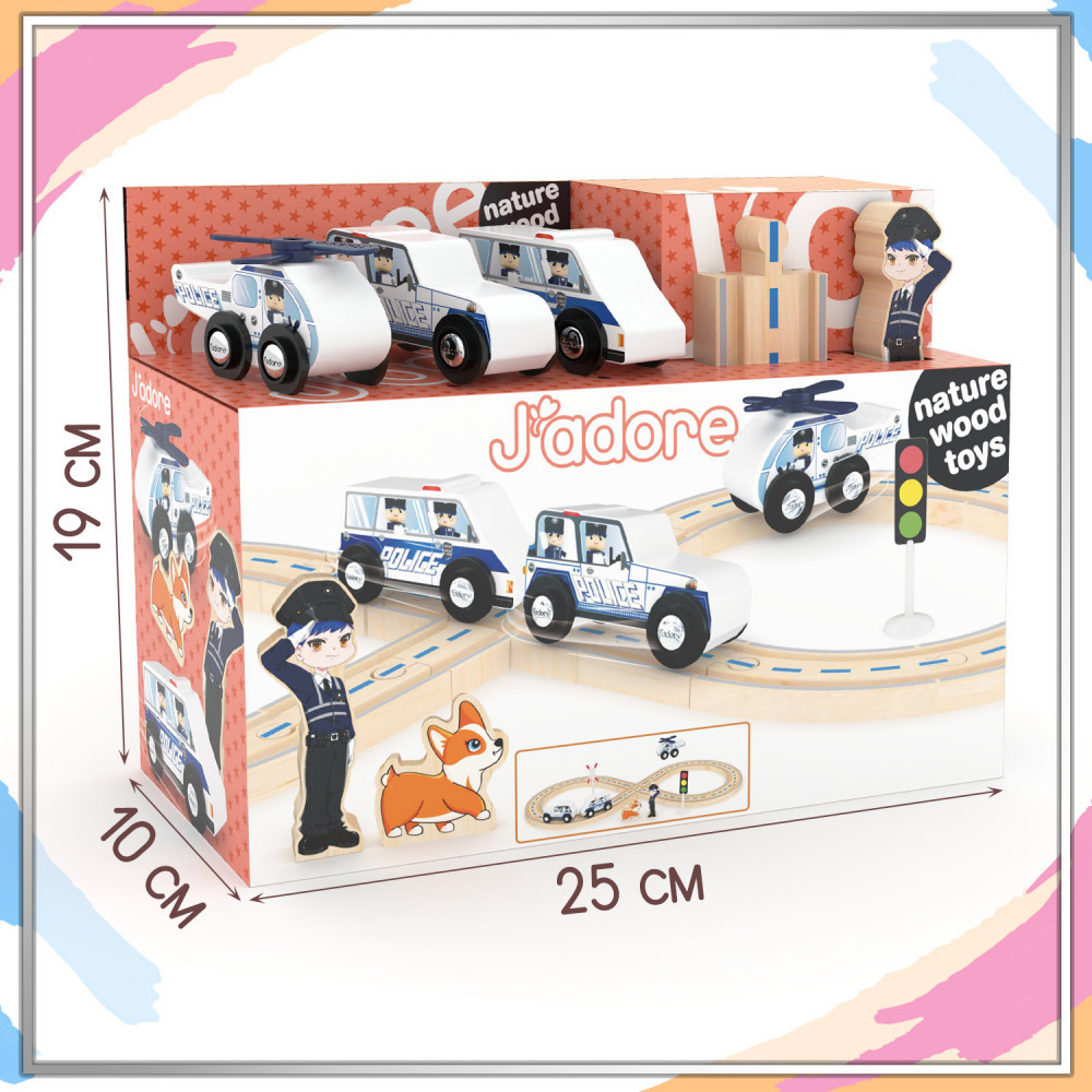Откройте мир творчества и приключений с набором игрушечного транспорта с деревянной ж/д от бренда J'adore! В набор входит игрушечная железная дорога, складывающаяся в "восьмёрку", фигурка полицейского, игровые аксессуары и 3 вида полицейских машин: внедорожник, вертолёт и фургон. Со всеми этими деталями можно придумать множество интересных сюжетов и историй. Комплект совместим с разнообразными моделями железных дорог (HAPE, BRIO, GIVITO и т.д.), что позволит расширить и разнообразить игровое пространство. Элементы набора сделаны из плотного, отшлифованного дерева. Детали не полые, имеют оптимальный размер и вес для детской руки.