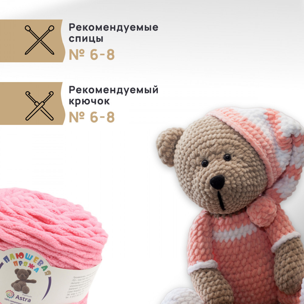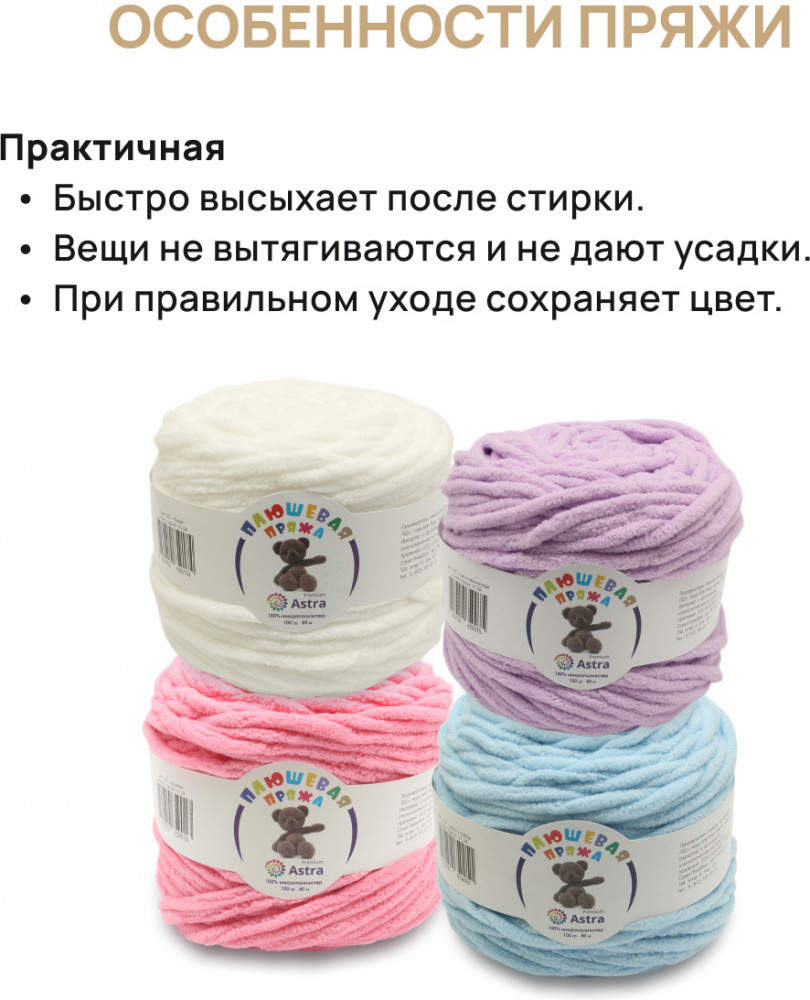 Пряжа Плюшевая от Astra Premium — это пряжа нежной текстуры с тончайшим пушистым ворсом, который придает изделиям объем, мягкость и ощущение комфорта. Нить плюшевой пряжи изготавливается из 100% микрополиэстера — материала, который не раздражает кожу и обладает рядом преимуществ. Микрополиэстер известен своей прочностью, устойчивостью к деформации и выцветанию. Благодаря этому изделия из Плюшевой пряжи сохраняют свою форму и яркость цвета на протяжении длительного времени, даже после многочисленных стирок. Из нее можно связать теплый и уютный свитер свободного кроя, который подарит комфорт в холодную погоду. Также она отлично подойдет для создания мягких игрушек. И, конечно же, Плюшевая пряжа — идеальный выбор для вязания пледов, которые создадут в вашем доме атмосферу тепла и уюта.