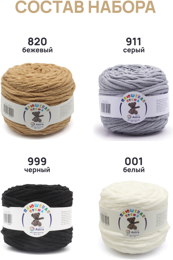 В наборе ассорти представлены 4 оттенка. Плюшевая пряжа производится на современном оборудовании итальянской марки GAUDINO, известной своими высокими стандартами качества.