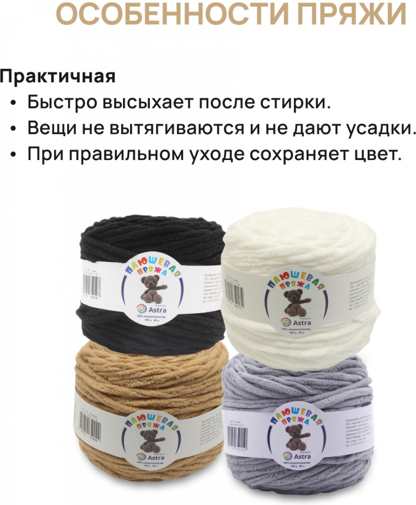 Пряжа Плюшевая от Astra Premium — это пряжа нежной текстуры с тончайшим пушистым ворсом, который придает изделиям объем, мягкость и ощущение комфорта. Нить плюшевой пряжи изготавливается из 100% микрополиэстера — материала, который не раздражает кожу и обладает рядом преимуществ. Микрополиэстер известен своей прочностью, устойчивостью к деформации и выцветанию. Благодаря этому изделия из Плюшевой пряжи сохраняют свою форму и яркость цвета на протяжении длительного времени, даже после многочисленных стирок. Из нее можно связать теплый и уютный свитер свободного кроя, который подарит комфорт в холодную погоду. Также она отлично подойдет для создания мягких игрушек. И, конечно же, Плюшевая пряжа — идеальный выбор для вязания пледов, которые создадут в вашем доме атмосферу тепла и уюта.