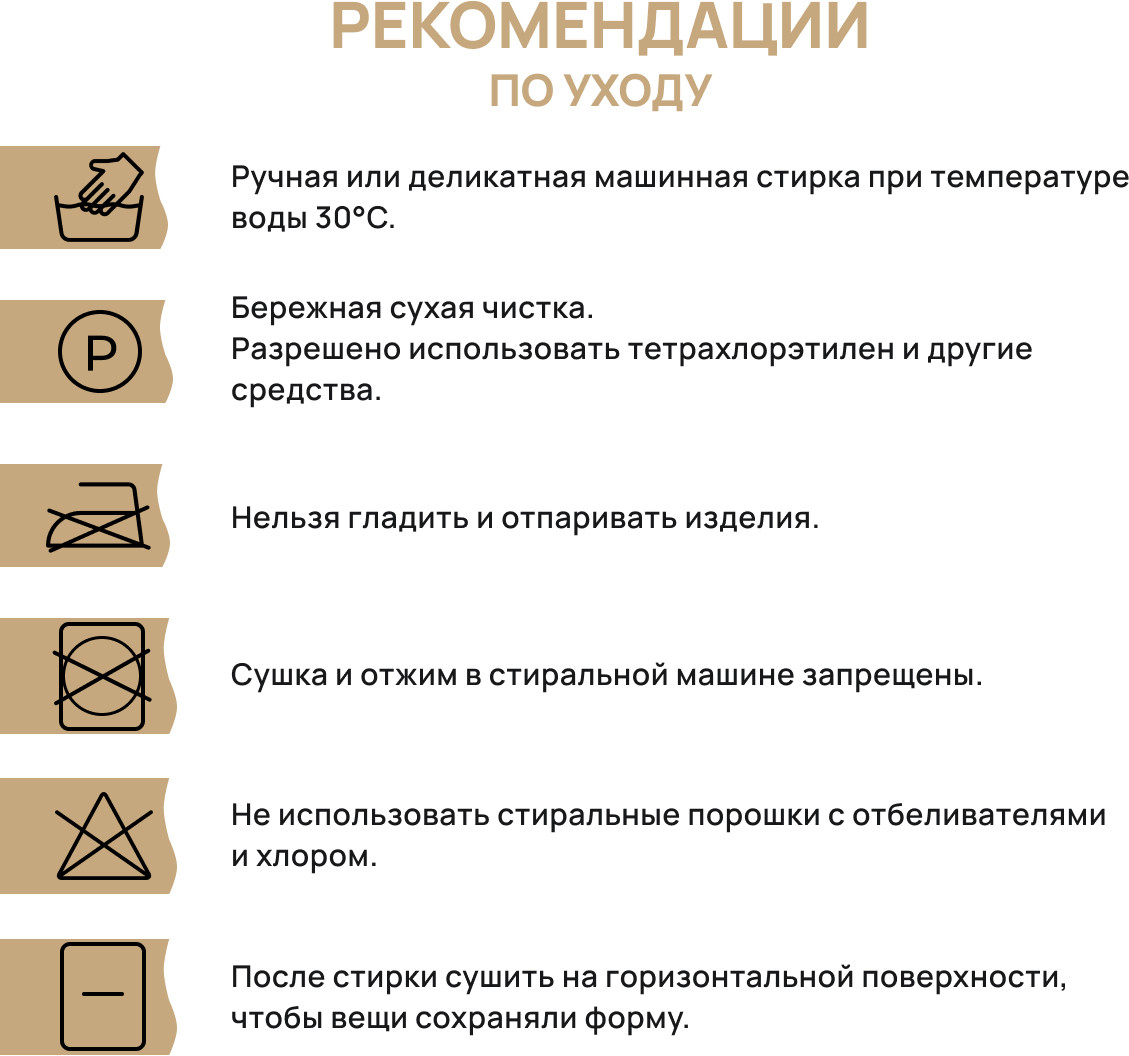 Рекомендации по уходу за изделиями: деликатная стирка при температуре 30 градусов без отбеливающих средств, не гладить, только естественная сушка, возможна профессиональная чистка.