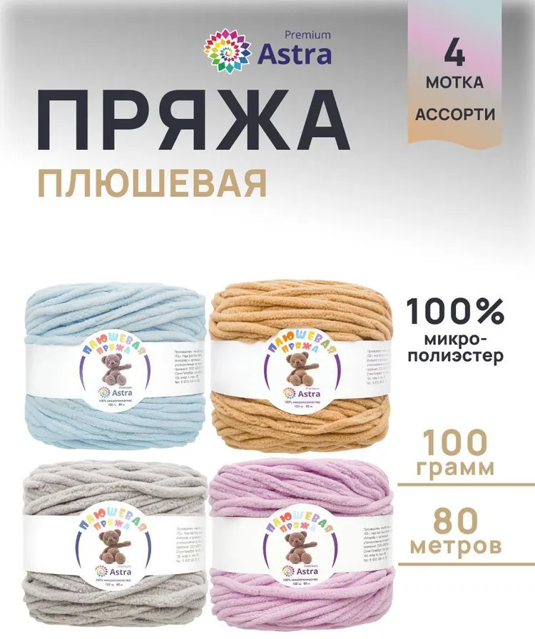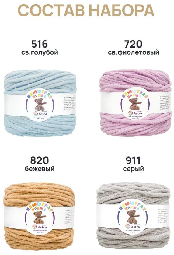 В наборе ассорти представлены 4 оттенка. Плюшевая пряжа производится на современном оборудовании итальянской марки GAUDINO, известной своими высокими стандартами качества.