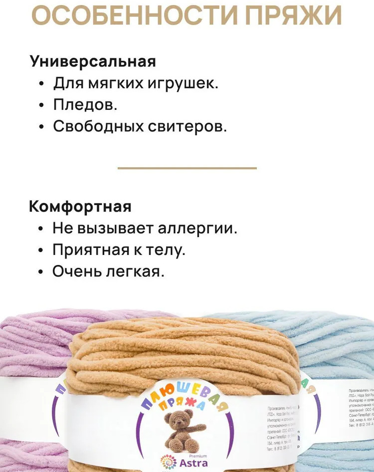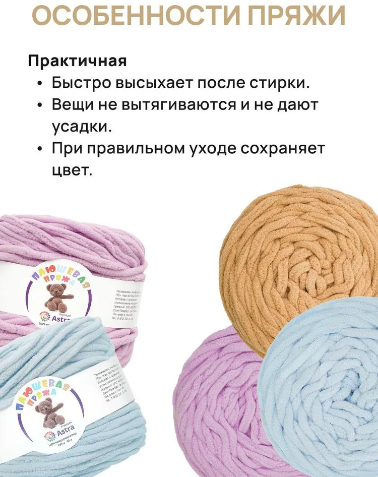 Пряжа Плюшевая от Astra Premium — это пряжа нежной текстуры с тончайшим пушистым ворсом, который придает изделиям объем, мягкость и ощущение комфорта. Нить плюшевой пряжи изготавливается из 100% микрополиэстера — материала, который не раздражает кожу и обладает рядом преимуществ. Микрополиэстер известен своей прочностью, устойчивостью к деформации и выцветанию. Благодаря этому изделия из Плюшевой пряжи сохраняют свою форму и яркость цвета на протяжении длительного времени, даже после многочисленных стирок. Из нее можно связать теплый и уютный свитер свободного кроя, который подарит комфорт в холодную погоду. Также она отлично подойдет для создания мягких игрушек. И, конечно же, Плюшевая пряжа — идеальный выбор для вязания пледов, которые создадут в вашем доме атмосферу тепла и уюта.