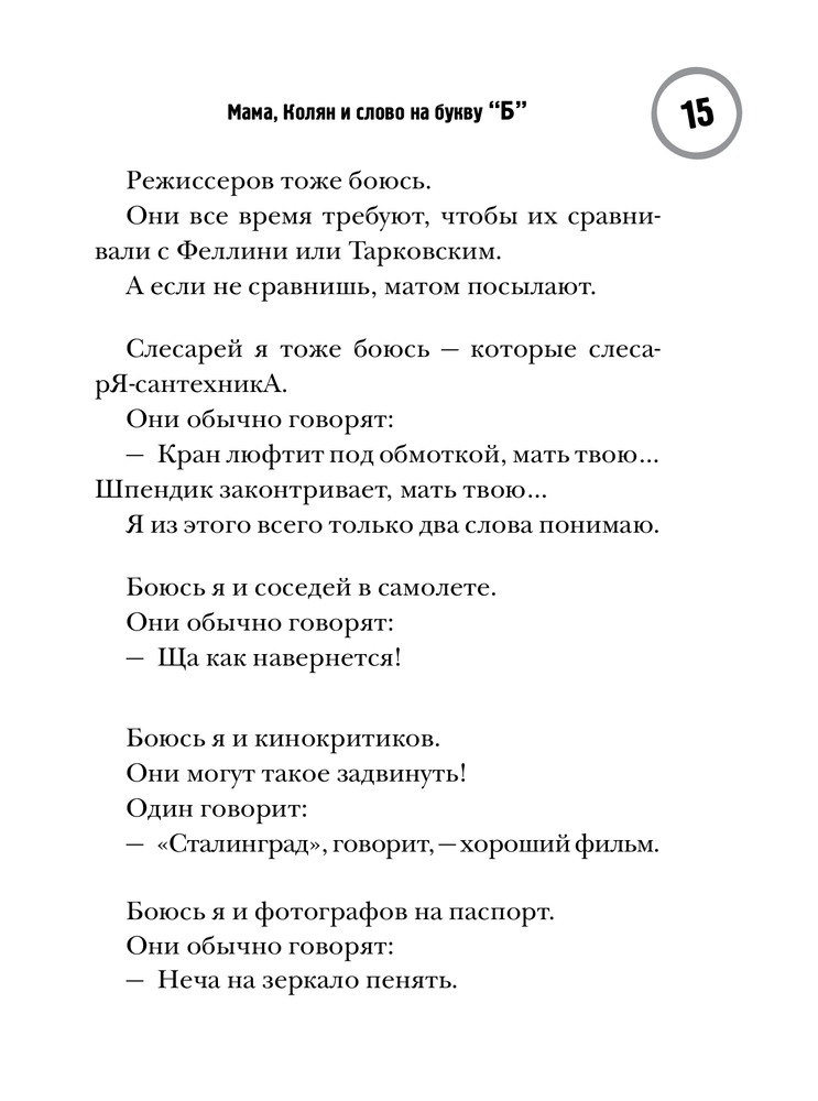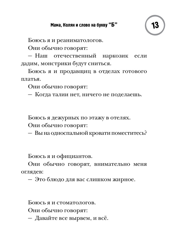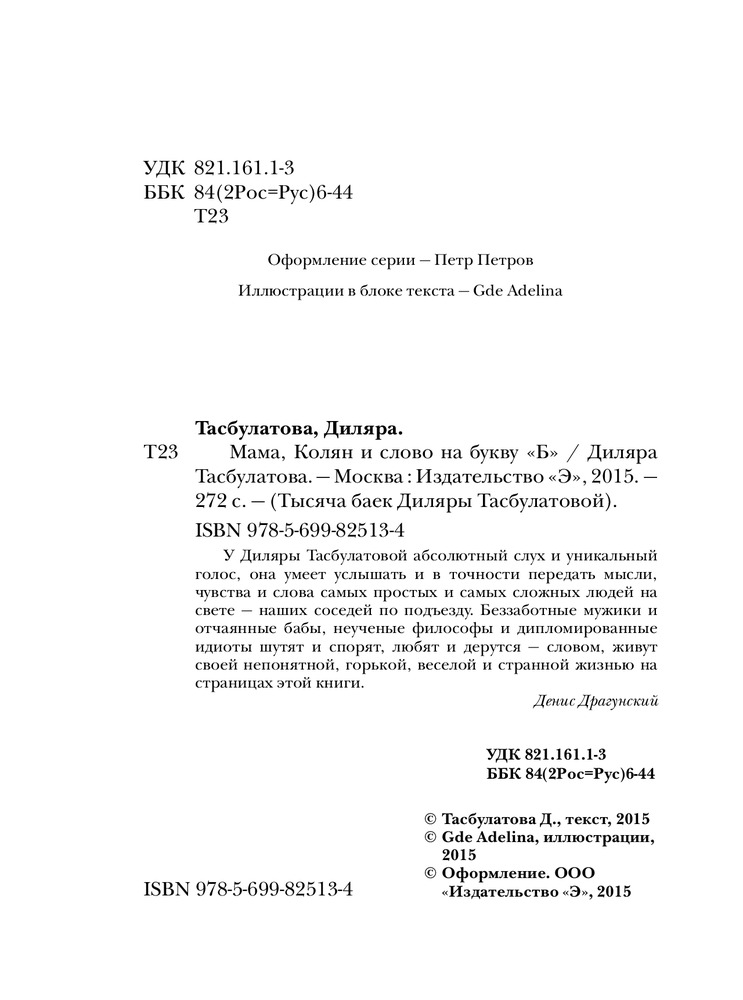 Мама, Колян и слово на букву «Б»В данный момент этот товар отсутствует в продаже. Возможно, у нас найдется аналогичный или похожий товар здесь. Серия: Тысяча баек Диляры Тасбулатовой У Диляры Тасбулатовой абсолютный слух и уникальный голос, она умеет услышать и в точности передать мысли, чувства и слова самых простых и самых сложных людей на свете — наших соседей по подъезду. Беззаботные мужики и отчаянные бабы, неученые философы и дипломированные идиоты шутят и спорят, любят и дерутся — словом, живут своей непонятной, горькой, веселой и странной жизнью на страницах этой книги. |