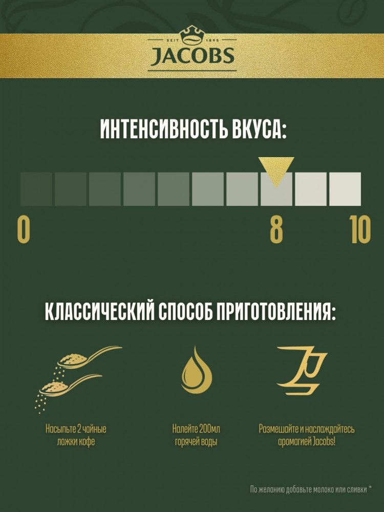 Выдающийся бренд кофе с богатым наследием, ставший настоящей иконой в мире кофейной культуры. Зародившись в далеком 1895 году благодаря вдохновению немецкого предпринимателя Иоганна Якобса, бренд сразу завоевал сердца любителей кофе. В настоящее время Jacobs является гордой частью семьи компаний Jacobs Douwe Egberts, олицетворяя изысканный вкус и безупречное качество.