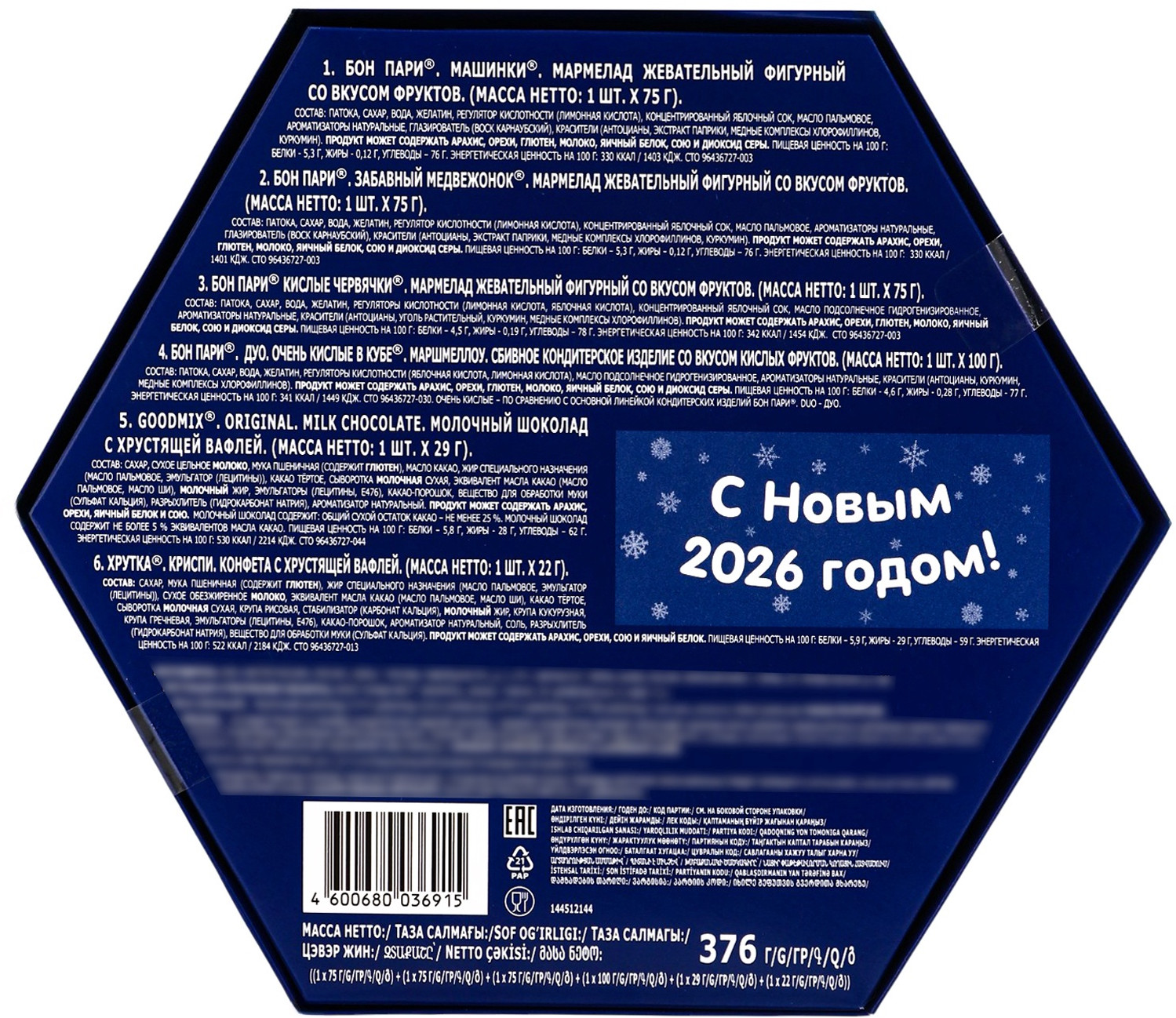 Продукт может содержать: арахис, орехи, глютен, молоко, яичный белок, сою и диоксид серы.