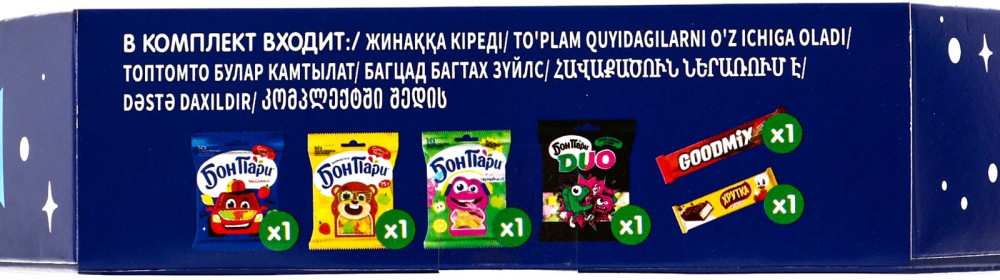 Шоколад молочный Goodmix «Original. Milk chocolate»: сахар, сухое цельное молоко, мука пшеничная (содержит глютен), масло какао, жир специального назначения (масло пальмовое, эмульгатор (лецитины)), какао тёртое, сыворотка молочная сухая, эквивалент масла какао (масло пальмовое, масло ши), молочный жир, эмульгаторы (лецитины, E476), какао-порошок, вещество для обработки муки (сульфат кальция), разрыхлитель (гидрокарбонат натрия), ароматизатор натуральный. Продукт может содержать: арахис, орехи, яичный белок и сою.