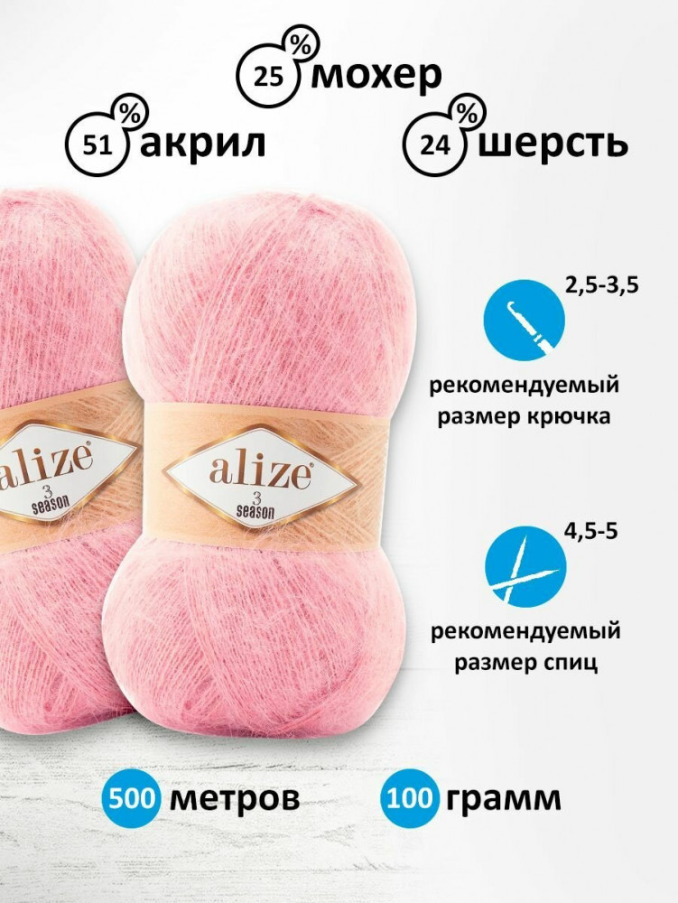 Пряжа 3 Season от Alize — прекрасный выбор для увлеченных вязальщиц. Она привлекает внимание длинным, нежным и воздушным ворсом, продуманной цветовой палитрой и высоким качеством. Благодаря большому содержанию натуральных волокон — шерсти и тонкого мохера — вещи из этой пряжи отлично согревают в прохладную погоду. Акриловое волокно придает готовому полотну прочность, устойчивость к усадке и приятную мягкую фактуру. В процессе вязания пряжа Alize 3 Season приятно скользит по спицам, не цепляясь и не образуя узелков. Рекомендуем вязать не слишком плотно, чтобы ворс лучше раскрылся. Аккуратно постирайте готовую вещь со специальным средством для шерсти и кондиционером, и ворс станет еще более мягким.