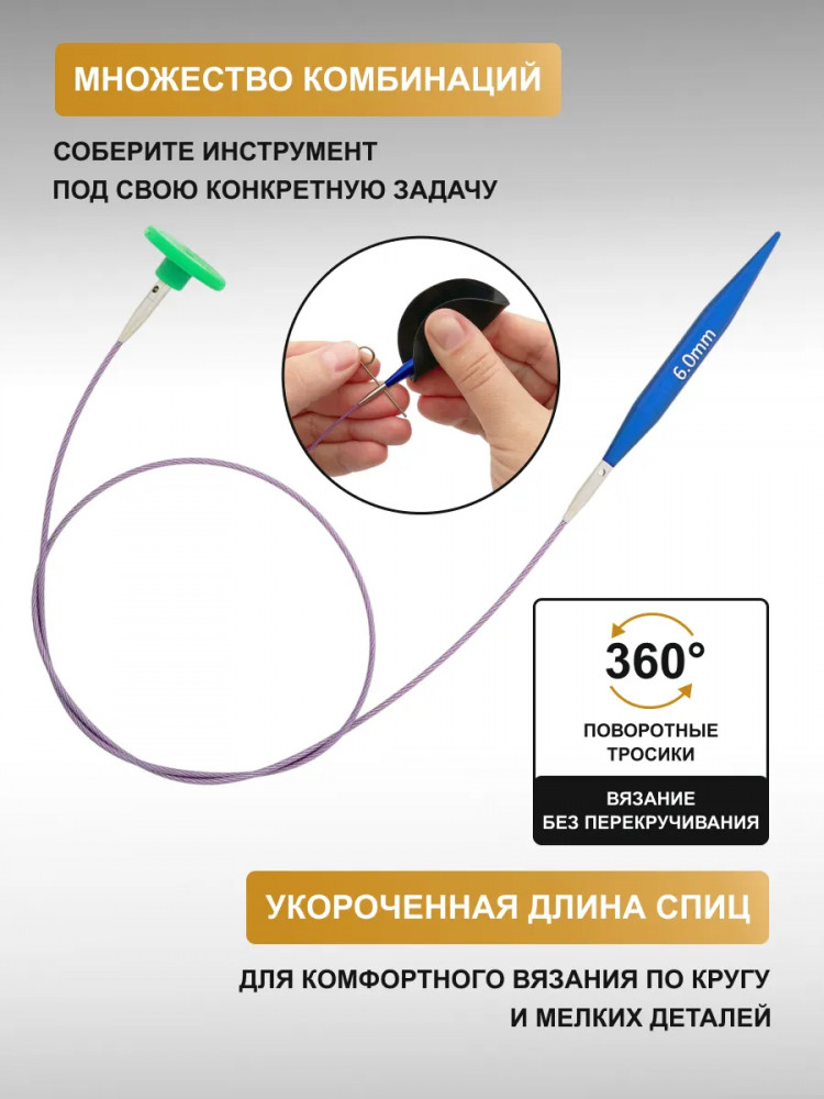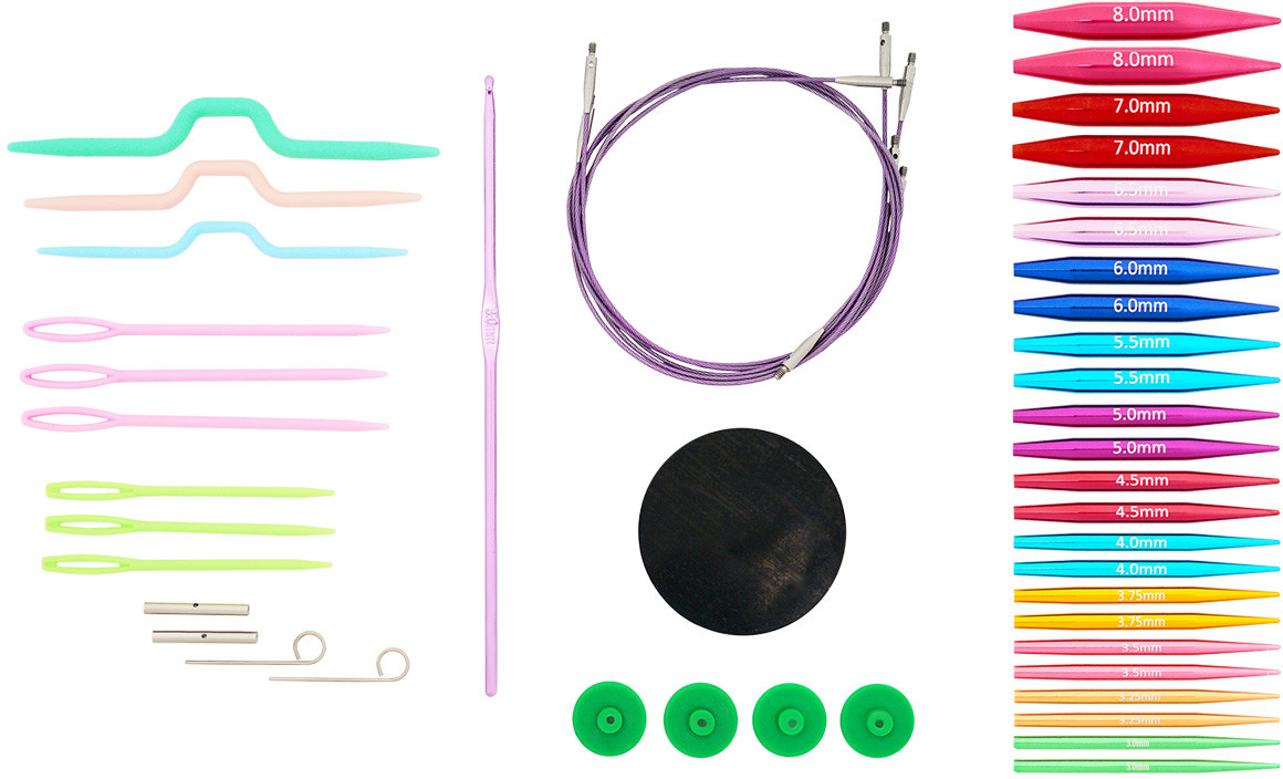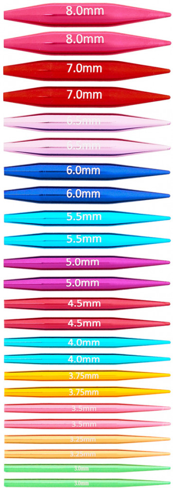 Спицы, изготовленные из легкого и прочного алюминия, позволяют вязать часами без усталости рук, даже крупные проекты. Цветное покрытие обеспечивает легкое скольжение нити, защищает поверхность от коррозии и предотвращает окрашивание светлой пряжи. Диаметр каждой спицы указан для быстрого поиска нужного размера. Съемная конструкция и сменные тросики позволяют создавать спицы для любых проектов, от воротников до пледов. Комбинируя спицы с тросиками Hobby&Pro, можно получить круговые спицы необходимой длины.