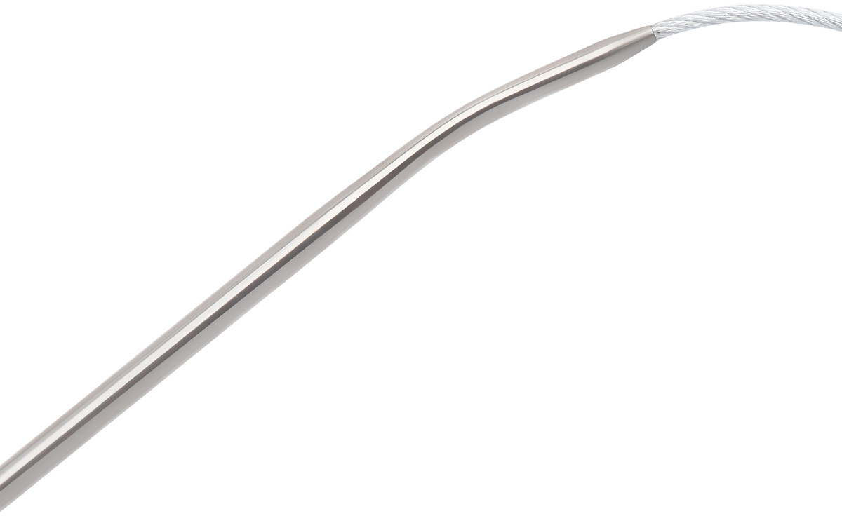Закругленные концы легко подцепляют петли, увеличивая скорость вязания. Кроме того, на переходе к тросику спицы изогнуты — это позволяет петлям легко соскальзывать на тросик, не создавая дополнительных трудностей для вязальщицы. Место соединения спицы и тросика выполнено идеально гладким, поэтому волокна пряжи не цепляются. Спицы круговые в наборе позволят работать с любыми видами пряжи без лишних усилий. Металлический тросик, покрытый тонким полимерным слоем, отличается высокой прочностью и гибкостью. Он не перекручивается в процессе работы, позволяя сосредоточиться на творческом процессе.