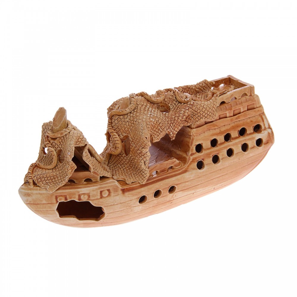Отличное качество, соответствует цене. Фото на сайте полностью совпадает. Приобретали специально для рыбы-нож, но он так понравился обитателям аквариума что нож только успевает выселять непрошеных гостей. Корабль достаточно прочный, не размокает, без запаха, цвет не меняет. Вместим, верх корабля имеет нишу, что хорошо для мелких рыбок. Спасибо магазину!