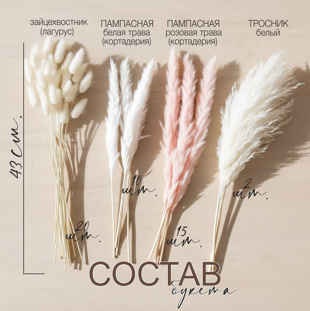Созданный с любовью и вниманием к каждому штриху, букет «Нежность» раскрывается в мягкой бело-розовой гамме, словно утренний свет, проливающийся через полупрозрачные шторы. В составе — тщательно подобранные сухоцветы: пушистая пампасная трава белых и нежно-розовых оттенков, воздушный белый тростник, добавляющий лёгкости, а также игривый зайцехвостник. Всего 47 веточек. Высота композиции — около 43 см, что делает букет универсальным элементом декора для гостиной, спальни, рабочего стола или фотозоны.