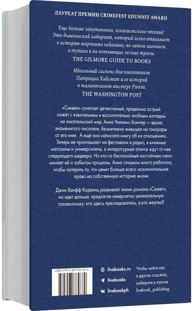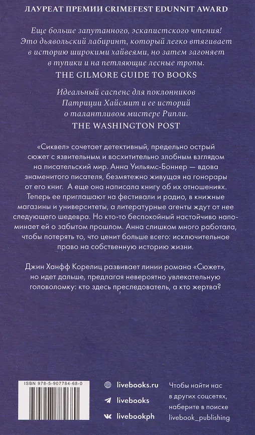 💳 Оплатить за товар можно при получении 🇰🇿 Есть бесплатная доставка по Казахстану 🎁 Копите бонусы с каждой покупки «Сиквел» сочетает детективный, предельно острый сюжет с язвительным, восхитительно злобным взглядом на писательский мир. Анна Уильямс-Боннер – вдова знаменитого писателя, безмятежно живущая на гонорары от его книг. А еще она написала книгу об их отношениях. Теперь ее приглашают на фестивали и на радио, в книжные магазины и университеты, а литературные агенты ждут от нее следующего шедевра. Но кто-то беспокойный настойчиво напоминает ей о забытом прошлом. Анна слишком много работала, чтобы потерять то, что она ценит больше всего: исключительное право на свою собственную историю жизни. Джинн Ханф Корелиц развивает линии романа «Сюжет», но идет дальше, предлагая невероятно увлекательную головоломку: кто здесь преследователь, а кто жертва? |