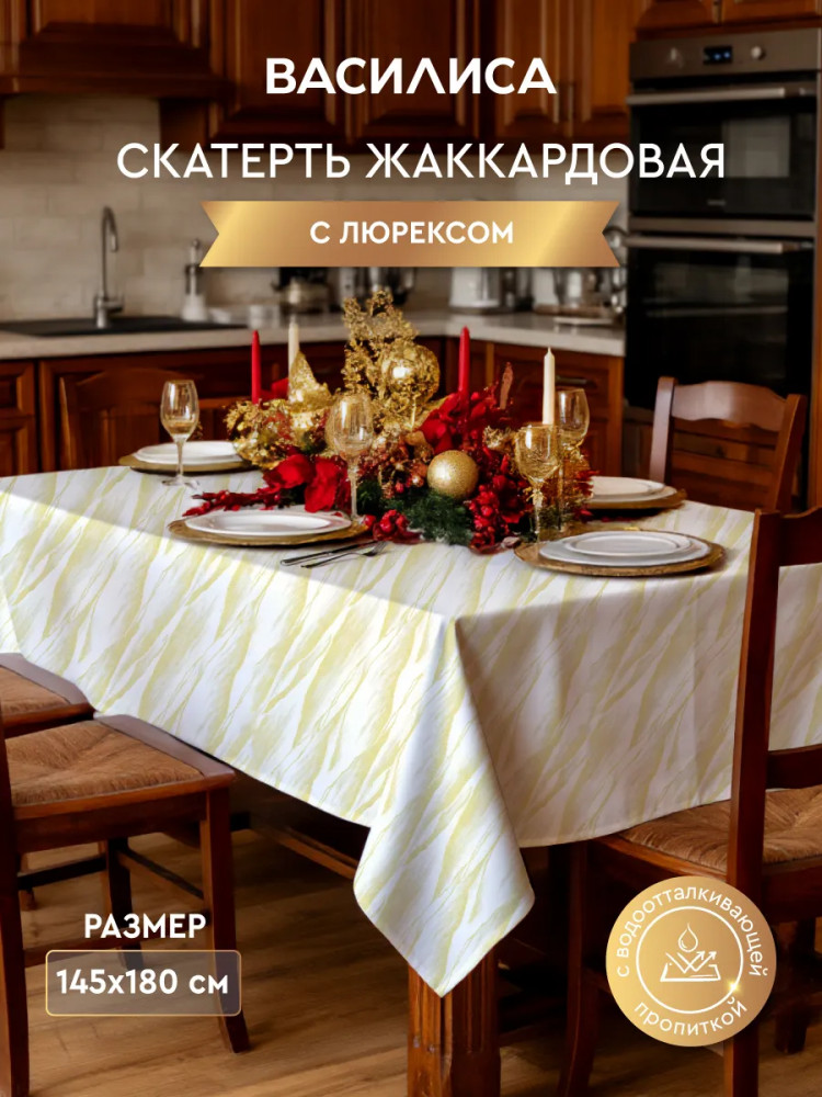Жаккардовая скатерть с водоотталкивающей пропиткой. Эта скатерть станет идеальным дополнением вашего стола, придавая ему элегантный и стильный вид. Скатерть изготовлена из 100% полиэстера, она отличается высокой износостойкостью и долговечностью, что делает её практичным выбором для повседневного использования. Благодаря специальной водоотталкивающей пропитке, скатерть защищает поверхность от пятен и влаги, что значительно упрощает уход за ней. Вы можете не беспокоиться о случайных пролитиях — достаточно просто протереть поверхность, и она снова будет выглядеть как новая. Такое надежное защитное покрытие незаменимо для вашего обеденного столика.