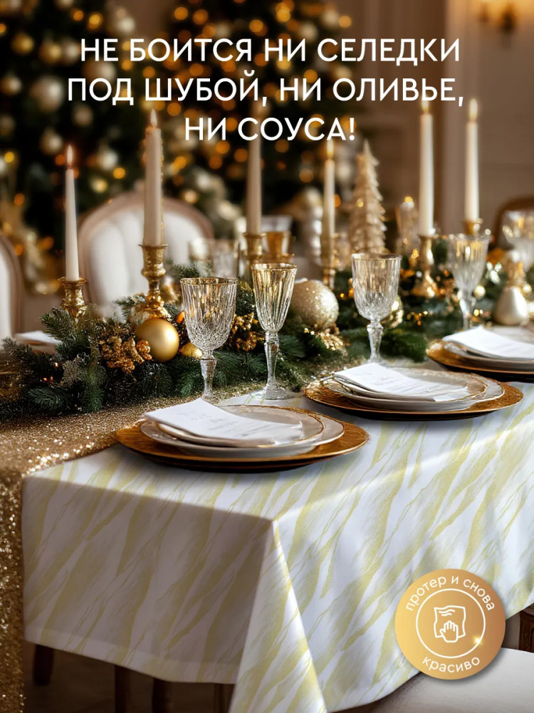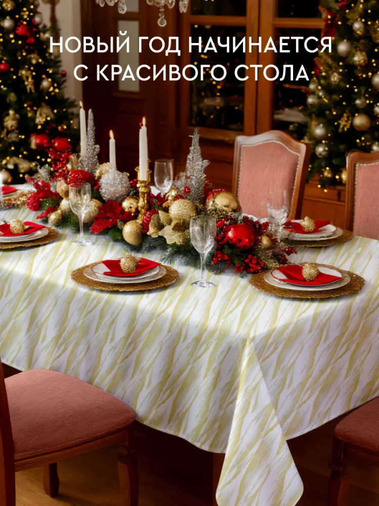 Жаккардовая скатерть с водоотталкивающей пропиткой. Эта скатерть станет идеальным дополнением вашего стола, придавая ему элегантный и стильный вид. Скатерть изготовлена из 100% полиэстера, она отличается высокой износостойкостью и долговечностью, что делает её практичным выбором для повседневного использования. Благодаря специальной водоотталкивающей пропитке, скатерть защищает поверхность от пятен и влаги, что значительно упрощает уход за ней. Вы можете не беспокоиться о случайных пролитиях — достаточно просто протереть поверхность, и она снова будет выглядеть как новая. Такое надежное защитное покрытие незаменимо для вашего обеденного столика.