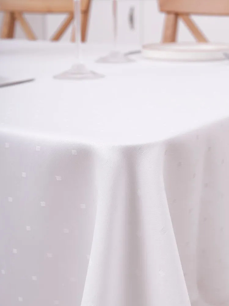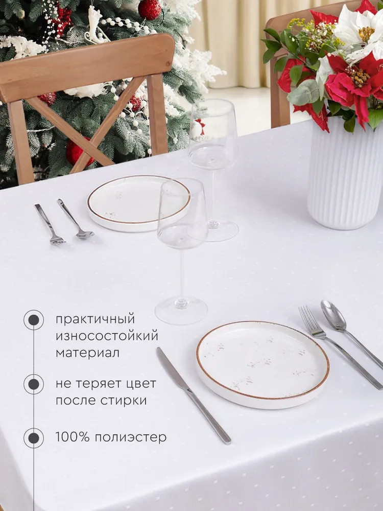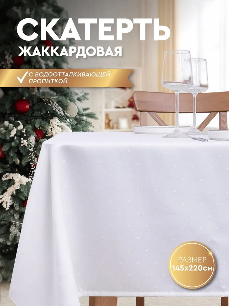 Жаккардовая скатерть с водоотталкивающей пропиткой. Эта скатерть станет идеальным дополнением вашего стола, придавая ему элегантный и стильный вид. Скатерть изготовлена из 100% полиэстера, она отличается высокой износостойкостью и долговечностью, что делает её практичным выбором для повседневного использования. Благодаря специальной водоотталкивающей пропитке, скатерть защищает поверхность от пятен и влаги, что значительно упрощает уход за ней. Вы можете не беспокоиться о случайных пролитиях — достаточно просто протереть поверхность, и она снова будет выглядеть как новая. Такое надежное защитное покрытие незаменимо для вашего обеденного столика.