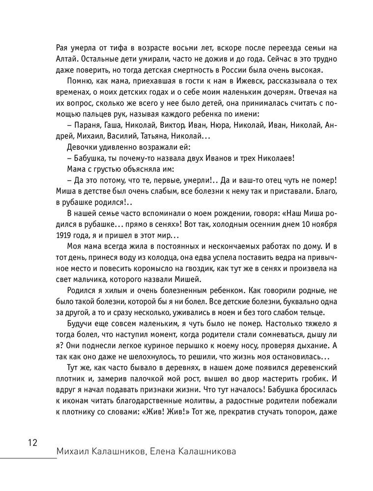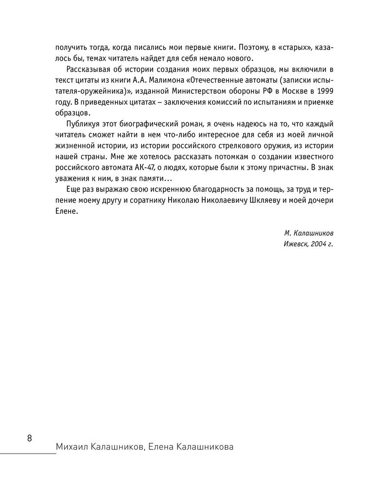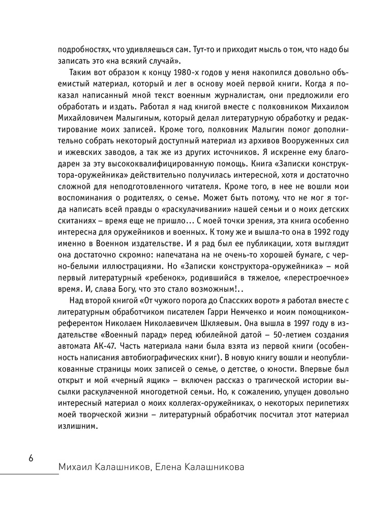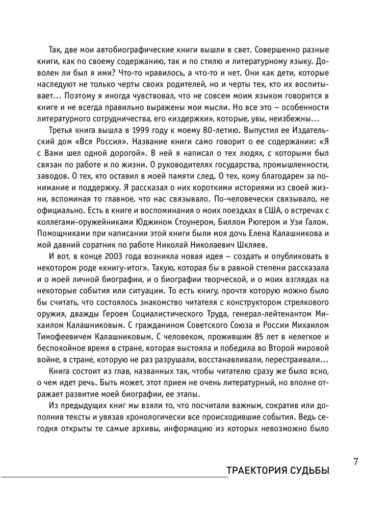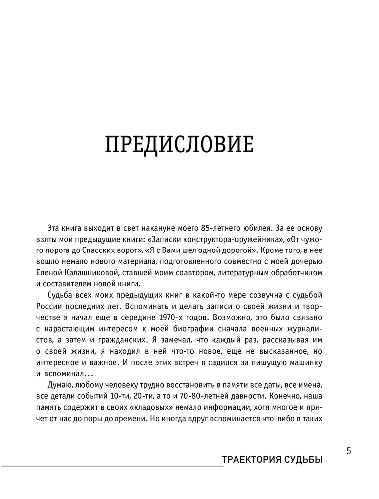 «…возникла новая идея — создать и опубликовать в некотором роде „книгу-итог“. Такую, которая бы в равной степени рассказала и о моей личной биографии, и о биографии творческой, и о моих взглядах на некоторые события или ситуации. То есть книгу, прочтя которую можно было бы считать, что состоялось знакомство читателя с конструктором стрелкового оружия. С человеком, прожившим 85 лет в нелегкое и беспокойное время в стране, которая выстояла и победила во Второй мировой войне, в стране, которую не раз разрушали, восстанавливали, перестраивали…» |