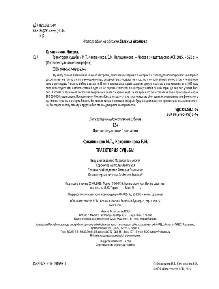 В данный момент этот товар отсутствует в продаже. Возможно, у нас найдется аналогичный или похожий товар здесь. Серия: Интеллектуальные биографии Эту книгу Михаил Калашников написал как третье, дополненное издание, в котором автор с неподдельной искренностью впервые рассказывает не только о коллегах-оружейниках, руководителях государства и т. д., но и о своих впечатлениях, о том, что оставило след в его сердце. Попав на войну в возрасте 22 лет и загоревшись идеей создания оружия простого в применении, он к 1947 году смог сконструировать автомат, ставший едва ли не первым символом, по которому жители разных стран до сих пор узнают Россию. Автомат Калашникова состоит на вооружении более 55 армий мира, за все время его существования было произведено около 100 000 000 экземпляров. Воспоминания Михаила Калашникова — это не просто рассказ об открытиях, совершенных на фоне самого трагичного периода в истории России. Это личная история человека, который, будучи сыном простого крестьянина-ссыльнопоселенца, благодаря своему таланту и трудолюбию стал выдающимся конструктором.
