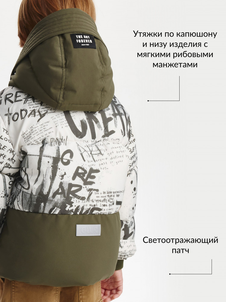 Серая зимняя куртка, выполненная из матовой влагостойкой плащовки, защитит мальчика от самых сильных морозов! Дизайн модели построен на яркой "газетной" графике, дополненной шрифтовыми изображениями, нанесенными от руки размашисто и небрежно. Отделка из однотонной плащовки, сформированная по принципу колорблокинга, уравновешивает динамичный рисунок, создает гармоничный баланс, способствует свежему восприятию вещи. Мягкая флисовая подкладка и утеплитель - искусственный пух - обеспечивают максимальный комфорт, уют и тепло. Важные функциональные детали: карманы-листочки на кнопках, съемный капюшон с длинным козырьком, утяжки по капюшону и низу изделия, мягкие рибовые манжеты, внутренние лямки, позволяющие в помещении носить куртку за спинкой как рюкзак, создают необходимое удобство в эксплуатации вещи. Куртка застёгивается на тракторную молнию с внутренней ветрозащитной планкой, исключающей травмирование подбородка. В оформлении модели использованы нашивка на капюшоне и светоотражающий патч, способствующий безоп