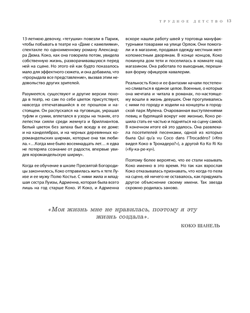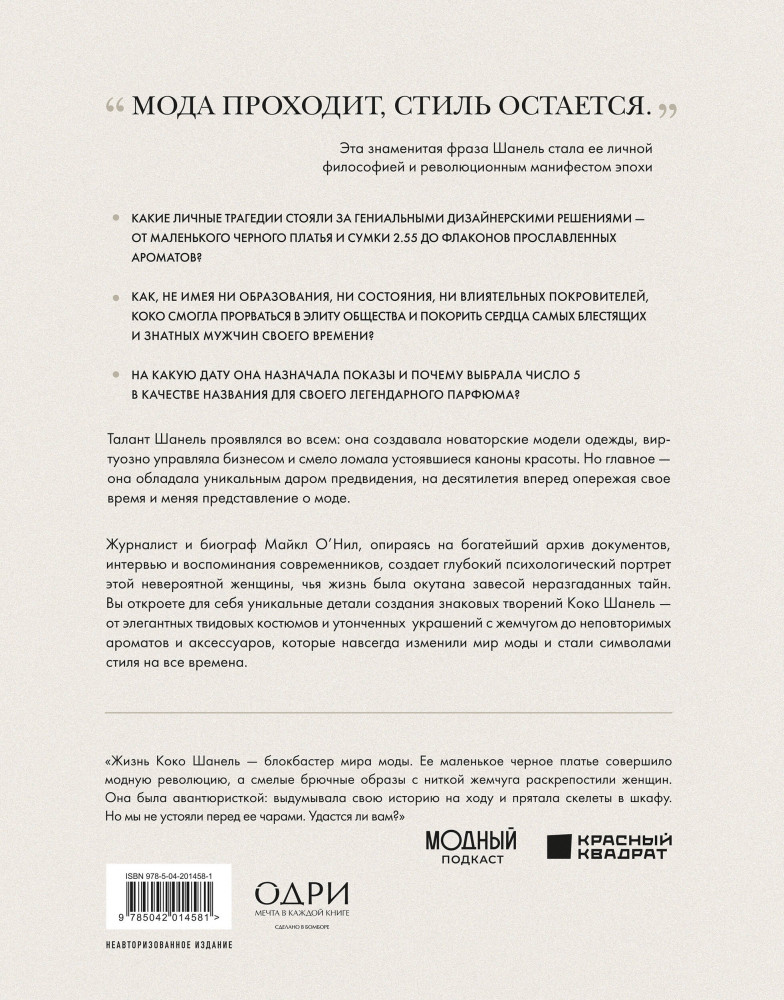 Эта книга — не просто биография, а глубокий психологический портрет женщины, которая превратила свою жизнь в легенду и сделала моду и стиль формой высказывания. Перед вами — история о таланте и невероятной силе характера. На основе архивов, писем и редких интервью автор книги Майкл О’Нил воссоздает живой образ великой Мадемуазель — дерзкой, независимой, непредсказуемой. Вы откроете для себя уникальные детали создания знаковых творений Коко Шанель — от элегантных твидовых костюмов и утонченных украшений с жемчугом до неповторимых ароматов и аксессуаров, которые навсегда изменили мир моды и стали символами стиля на все времена.