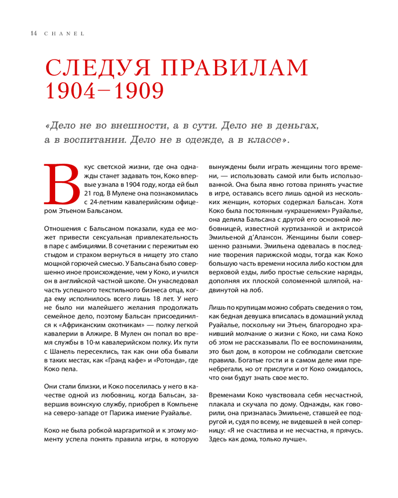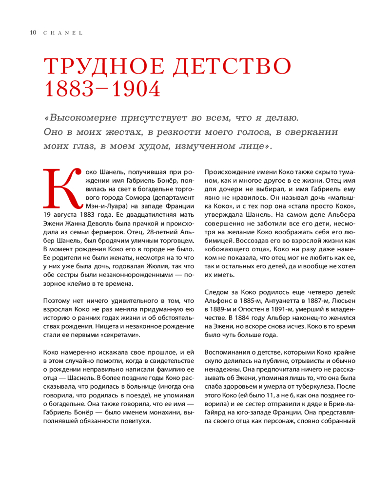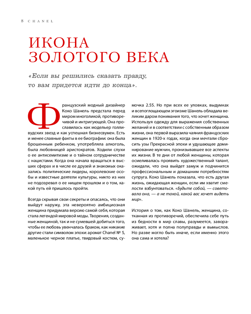 Мелованная бумага, редкие иллюстрации, стильная обложка, подарочное издание, эксклюзивные подробности создания культовых символов дома Chanel. Книга будет интересна всем, кто увлекается историей, интересуется миром моды и красоты. |