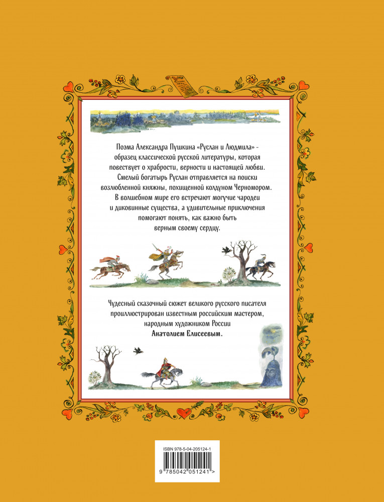 💳 Оплатить за товар можно при получении 🇰🇿 Есть бесплатная доставка по Казахстану 🎁 Копите бонусы с каждой покупки Серия: Золотые сказки для детей Волшебная, покоряющая с первых строк поэма «Руслан и Людмила» — это подлинный бриллиант русской классики, достойный самой изысканной оправы. Чудесные события давно минувших дней, диковинные существа, могущественные чародеи, сияющие чертоги и великие сражения словно наяву встают перед глазами восхищённого читателя. «Преданья старины глубокой», изложенные гениальным пером великого поэта, кажутся произошедшими совсем недавно, а сказочное Лукоморье и его обитатели навсегда остаются в памяти. |
