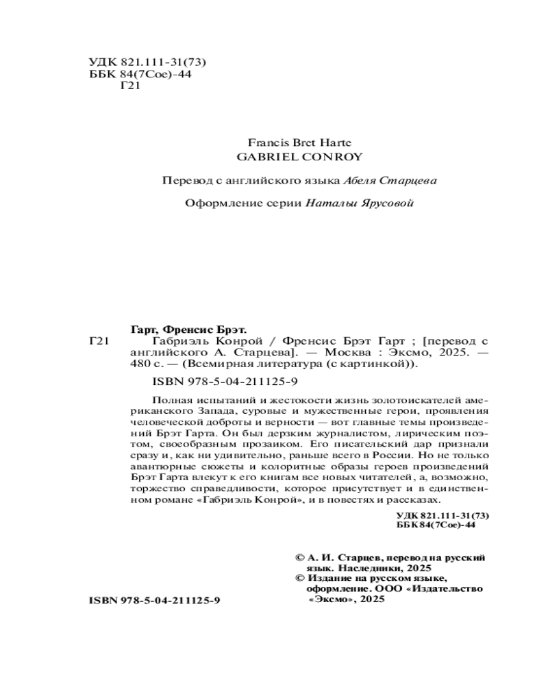 💳 Оплатить за товар можно при получении 🇰🇿 Есть бесплатная доставка по Казахстану 🎁 Копите бонусы с каждой покупки Серия: Всемирная литература (новое оформление) Полная испытаний и жестокости жизнь золотоискателей американского Запада, суровые и мужественные герои, проявления человеческой доброты и верности — вот главные темы произведений Брет Гарта. Он был дерзким журналистом, лирическим поэтом, своеобразным прозаиком. Его писательский дар признали сразу и, как ни удивительно, раньше всего в России. Но не только авантюрные сюжеты и колоритные образы героев произведений Брет Гарта влекут к его книгам всё новых читателей, а, возможно, торжество справедливости, которое присутствует и в единственном романе «Габриэль Конрой», и в повестях и рассказах. |