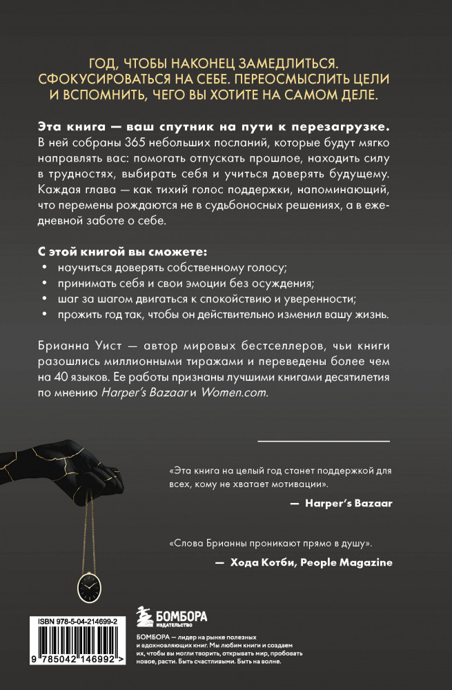 💳 Оплатить за товар можно при получении 🇰🇿 Есть бесплатная доставка по Казахстану от 1 дня 🎁 Копите бонусы с каждой покупки Серия: Сначала — ты. Книги об исцелении и трансформации Год, чтобы наконец замедлиться. Сфокусироваться на себе. Переосмыслить цели и вспомнить, чего вы хотите на самом деле. Эта книга — ваш спутник на пути к перезагрузке. В ней собраны 365 небольших посланий, которые будут мягко направлять вас: помогать отпускать прошлое, находить силу в трудностях, выбирать себя и учиться доверять будущему. Каждая глава — как тихий голос поддержки, напоминающий, что перемены рождаются не в судьбоносных решениях, а в ежедневной заботе о себе. |