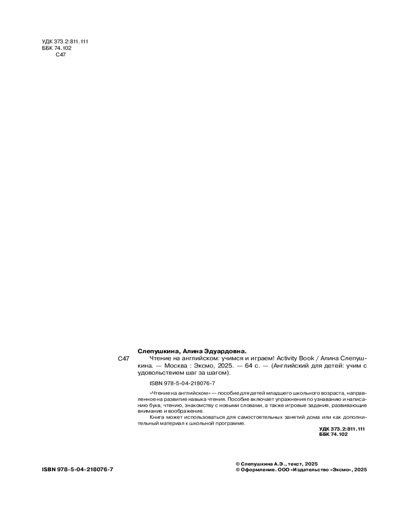 💳 Оплатить за товар можно при получении 🇰🇿 Есть бесплатная доставка по Казахстану от 1 дня 🎁 Копите бонусы с каждой покупки Серия: Английский для детей: учим с удовольствием шаг за шагом «Чтение на английском» — это увлекательное пособие, которое поможет ребенку сделать первые шаги в освоении навыка чтения на английском языке. Ребята будут учиться узнавать и правильно писать буквы, читать простые слова и предложения, а также расширять словарный запас. Игровые упражнения и занимательные задания превращают обучение в захватывающий процесс, развивая внимание, воображение и интерес к языку. Книга подойдет детям младшего школьного возраста и станет отличным помощником как для самостоятельных занятий дома, так и в качестве дополнения к школьной программе. |