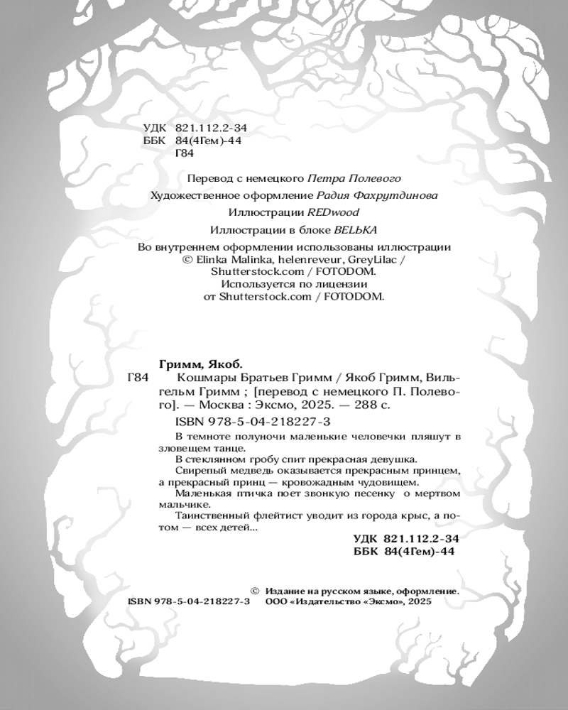 💳 Оплатить за товар можно при получении 🇰🇿 Есть бесплатная доставка по Казахстану 🎁 Копите бонусы с каждой покупки Серия: Young Adult. Жуткая классика Красивое издание самых жутких и пугающих сказок Якоба и Вильгельма Гримм: «Девушка без рук», «Поющая косточка», «Крысолов из Гамельна», «Ворониха», «Сказка о заколдованном дереве», «Бедный мальчик в могиле» и не только. |