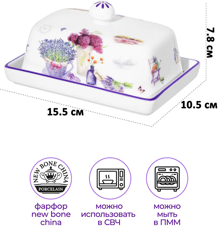 💳 Оплатить за товар можно при получении 🇰🇿 Есть бесплатная доставка по Казахстану от 1 дня 🎁 Копите бонусы с каждой покупки Серия: Лаванда Маслёнка из серии «Лаванда» от Elan Gallery предназначена для хранения и сервировки сливочного масла. Размер изделия — 15,5×10,5×7,8 см. Внутренний размер под крышкой — 13×8 см, высота блюда без крышки — 2 см. Выполнена из фарфора нового поколения new bone china, сочетающего в себе изящность и высокую прочность. За счёт гладкости изделия легко отмываются, поэтому сохраняют привлекательный внешний вид и практичны в использовании. Плотная структура материала позволяет посуде дольше сохранять температуру блюд и напитков. От других видов костяного фарфора new bone china отличается большей экологичностью в производстве. |