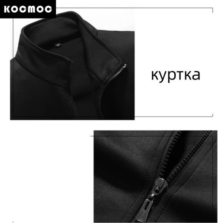 Костюм состоит из куртки, толстовки и брюк. Ткань из полиэстера сохраняет одежду ровной и не мнется. Куртка имеет воротник-стойку, застежку-молнию и боковые карманы.
