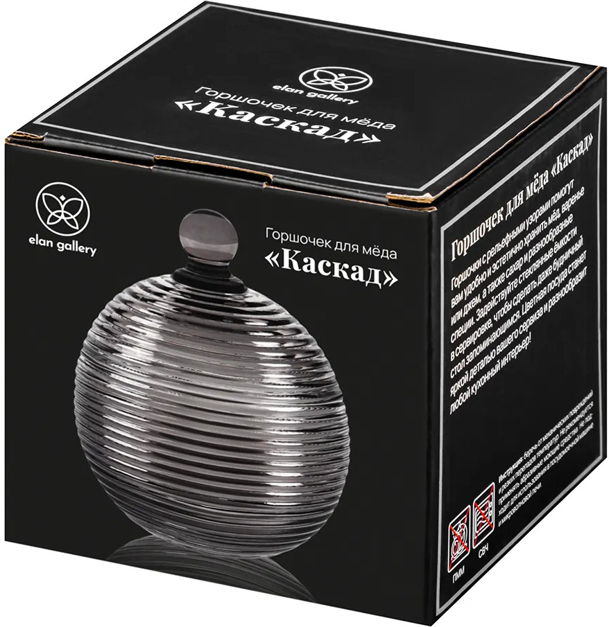 Горшочек для мёда из серии «Каскад» от Elan Gallery послужит для организации хранения продуктов на вашей кухне. Размер ёмкости — 10,7×10,7×13,5 см, объём — 300 мл. Высота без крышки — 7 см. Выполнен из стекла и украшен рельефом в виде полос, напоминающих плавно стекающие потоки воды. Декоративная баночка круглой формы станет гармоничным дополнением при сервировке вашего стола как в будни, так и в праздник. Красивый дизайн и лаконичный серый цвет позволят использовать её не только для хранения, но и для подачи к столу. Заполните ёмкость сахаром и солью, специями и приправами, чтобы во время приготовления и приёма пищи всё необходимое было под рукой. Засыпьте внутрь чай или кофе, чтобы в любой момент заварить свежий напиток. Храните в ней закуски и сладости: ягоды, орехи и сухофрукты, леденцы и конфеты. Подайте джем, варенье или соус. Используйте в качестве медовницы или икорницы, чтобы удивить гостей необычной сервировкой.