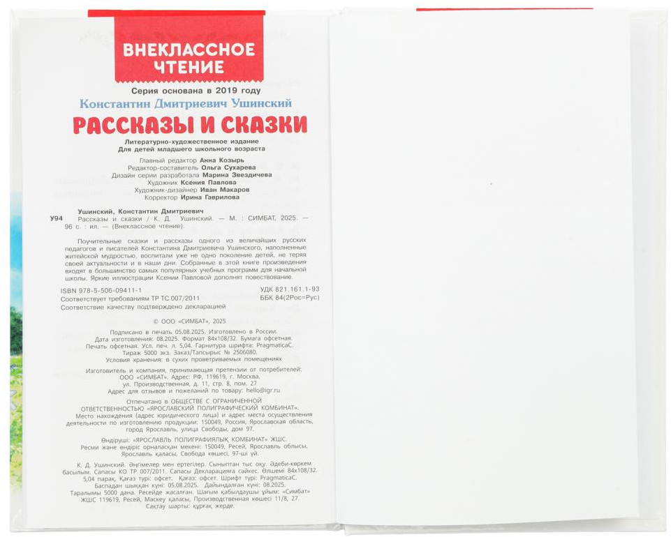 💳 Оплатить за товар можно при получении 🇰🇿 Есть бесплатная доставка по Казахстану 🎁 Копите бонусы с каждой покупки Серия: Внеклассное чтение Книга «К. Д. Ушинский. Рассказы и сказки» из серии «Внеклассное чтение» ТМ «УМка» — отличный вариант для самостоятельного чтения вне занятий в школе. В книгу вошли рассказы о животных и природе, а также авторские сказки известного русского писателя Константина Дмитриевича Ушинского, рекомендованные ФГОСом и различными образовательными программами детям младшего школьного возраста для внеклассного чтения. Ребёнок с удовольствием погрузится в чтение увлекательных историй о братьях наших меньших, а красочные картинки оживят повествование. Благодаря компактному размеру книгу удобно брать с собой в дорогу. Чтение книг из серии «Внеклассное чтение» ТМ «УМка» расширяет кругозор и развивает: образное мышление, визуальное восприятие, внимание, память и речь. |