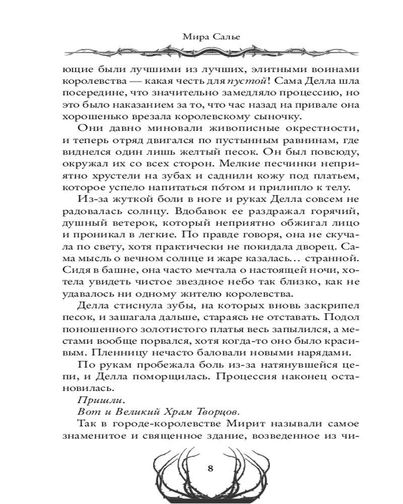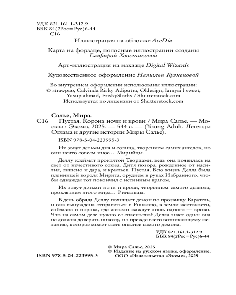 💳 Оплатить за товар можно при получении 🇰🇿 Есть бесплатная доставка по Казахстану от 1 дня 🎁 Копите бонусы с каждой покупки Серия: Young Adult. Легенды Оглама и другие истории Миры Салье Мирийцы, которых зовут детьми дня и солнца, стражами света — творение самих ангелов. У них могучие белоснежные крылья, а в их жилах течет золотая кровь. Испокон веков они охраняют поднебесный мир от ринальцев, которых зовут детьми ночи и крови, творением самого дьявола... Делла — девушка, которую клеймят проклятой Творцами. Всю жизнь она была пленницей короля Мирита, орудием в руках избранного, чтобы однажды тот покончил с истинным врагом. В день обряда Деллу похищает таинственный незнакомец, и она вынуждена отправиться в Риналию, в земли жестокости и порока, где демоны жаждут лишь крови. Что на самом деле нужно ее спасителю? |
