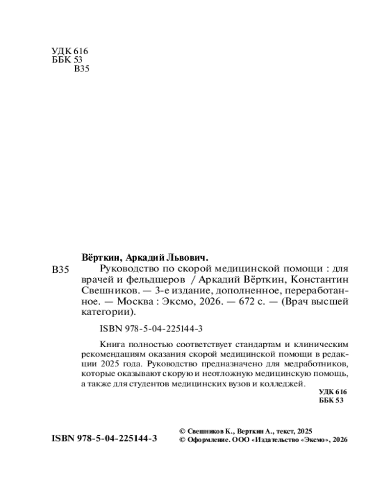 💳 Оплатить за товар можно при получении 🇰🇿 Есть бесплатная доставка по Казахстану 🎁 Копите бонусы с каждой покупки Серия: Врач высшей категории (обложка) Руководство полностью соответствует клиническим рекомендациям 2025 года и состоит из четырех разделов. Раздел «Алгоритмы оказания скорой и неотложной медицинской помощи» содержит краткую информацию по оказанию медицинской помощи при основных экстренных и неотложных состояниях. Основу алгоритмов составили клинические рекомендации, одобренные Научно-практическим советом Минздрава России в последние годы, а также клинические рекомендации Национальных научно-практических обществ. Раздел «Основы ЭКГ для врача и фельдшера скорой медицинской помощи» содержит информацию по ЭКГ-диагностике острого коронарного синдрома, нарушениях сердечного ритма, гипертрофии предсердий и желудочков, необходимую для правильной интерпретации ЭКГ на догоспитальном этапе. Раздел «Лекарственные средства, применяемые в лечении экстренных и неотложных состояний» раскрывает вопросы применения лекарственных препаратов, входящих в состав укладок бригад СМП в соответствии с Приказом Минздрава России от 28.10.2020 г. № 1165н «Об утверждении требований к комплектации лекарственными препаратами и медицинскими изделиями укладок и наборов для оказания скорой медицинской помощи». |