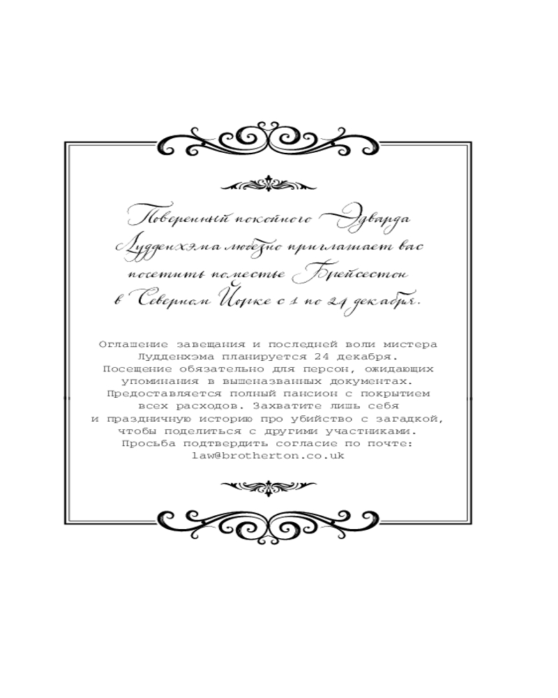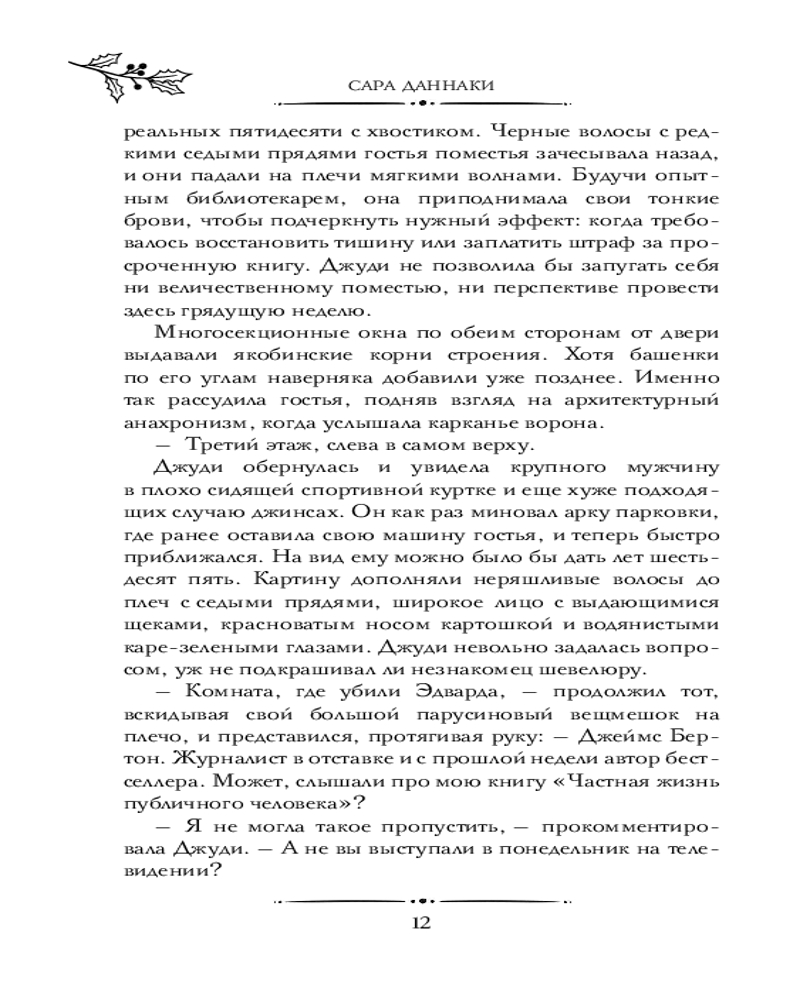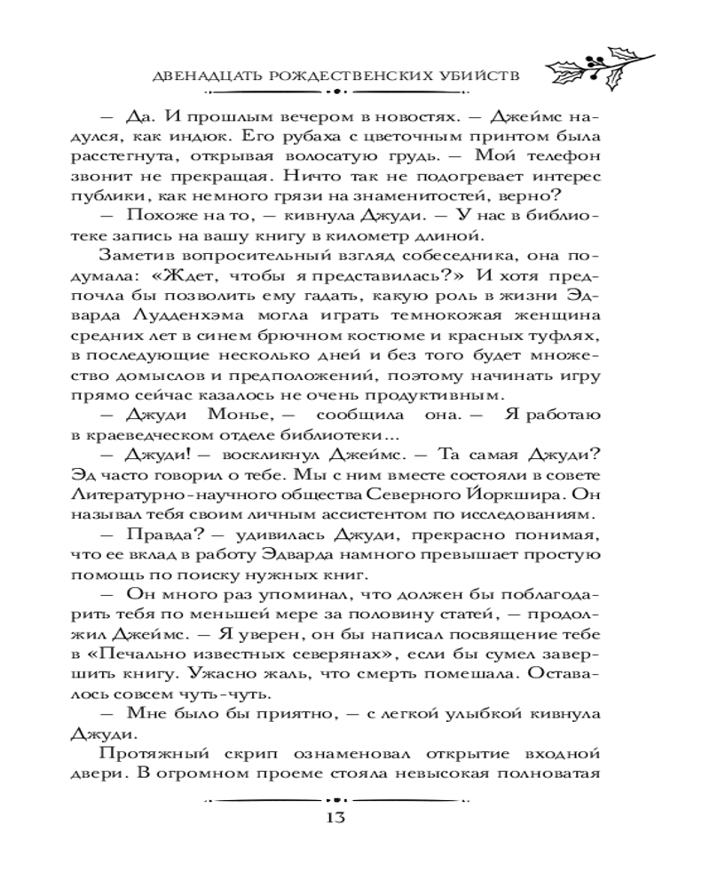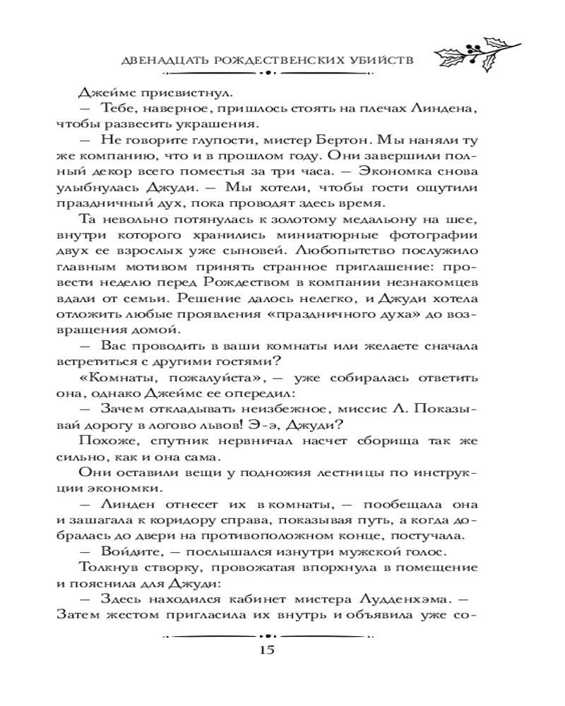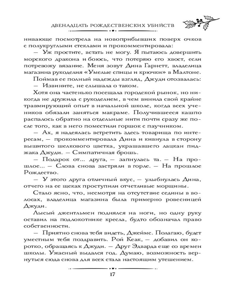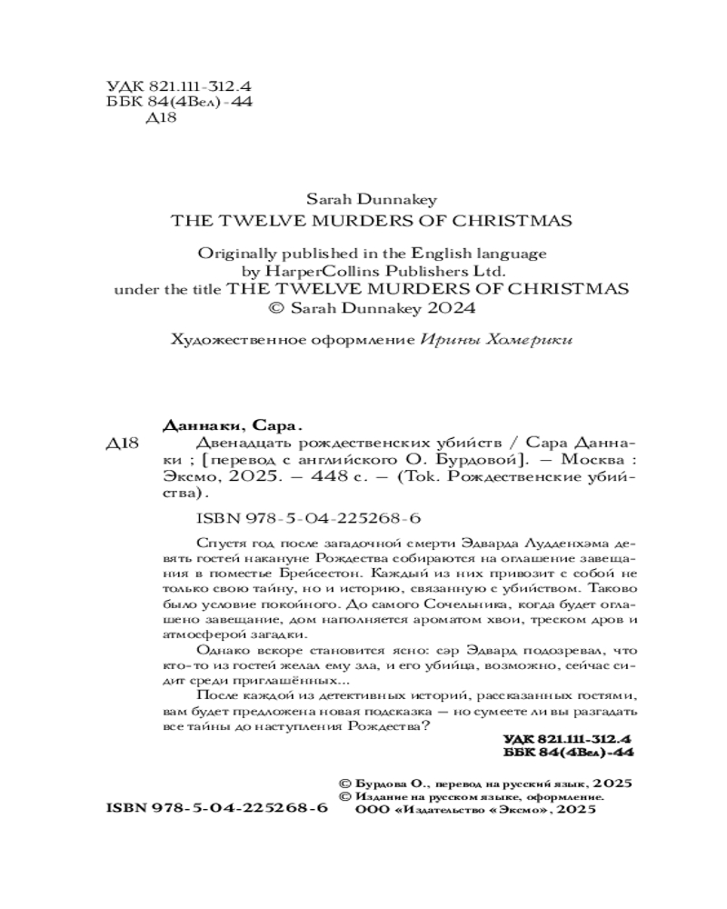 Двенадцать рождественских убийствВ данный момент этот товар отсутствует в продаже. Возможно, у нас найдется аналогичный или похожий товар здесь. Серия: Tok. Рождественские убийства Спустя год после загадочной смерти Эдварда Лудденхэма девять гостей накануне Рождества собираются на оглашение завещания в поместье Брейсестон. Каждый из них привозит с собой не только свою тайну, но и историю, связанную с убийством. Таково было условие покойного. До самого Сочельника, когда будет оглашено завещание, дом наполняется ароматом хвои, треском дров и атмосферой загадки. Однако вскоре становится ясно: сэр Эдвард подозревал, что кто-то из гостей желал ему зла, и его убийца, возможно, сейчас сидит среди приглашённых... |