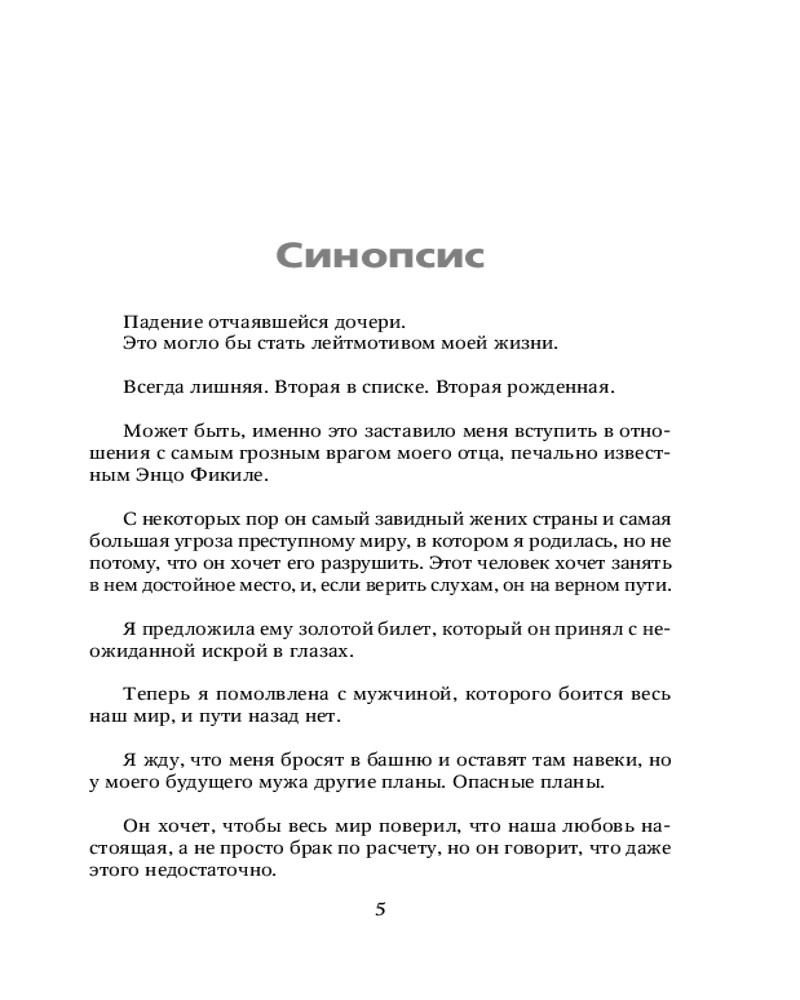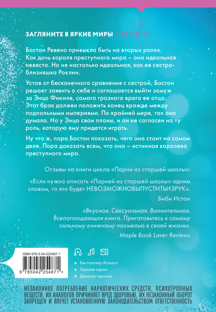 💳 Оплатить за товар можно при получении 🇰🇿 Есть бесплатная доставка по Казахстану 🎁 Копите бонусы с каждой покупки Серия: Pink Room. Элитные парни Меган Брэнди Бостон Ревено привыкла быть на вторых ролях. Как дочь короля преступного мира — она идеальная невеста. Но не настолько идеальная, как ее сестра-близняшка Роклин. Устав от бесконечного сравнения с сестрой, Бостон решает заявить о себе и соглашается выйти замуж за Энцо Фикиле, самого грозного врага ее отца. Этот брак должен положить конец вражде между подпольными империями. По крайней мере, так она думала. Но у Энцо свои планы, и он не согласен на ту роль, которую ему придется играть. Ну что ж, пора Бостон показать, чего она стоит на самом деле. Пора доказать всем, что она — истинная королева преступного мира. |