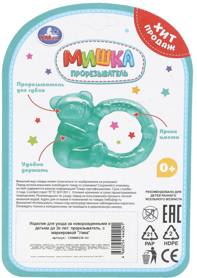 💳 Оплатить за товар можно при получении 🇰🇿 Есть бесплатная доставка по Казахстану 🎁 Копите бонусы с каждой покупки Прорезыватель «Мишка» ТМ «УМка» — необходимая вещь в период роста зубок у малыша. Основная функция такой игрушки — массаж дёсен, который способствует притоку крови, формирует правильный прикус и облегчает боль при прорезывании зубов. Яркий прорезыватель в виде медвежонка с кольцом удобно держать маленькими ручками. Игрушка изготовлена из нежных, но прочных и экологически чистых материалов, что делает её удобной для прикуса. Охлаждать только в холодильнике, не помещать в морозильную камеру! |