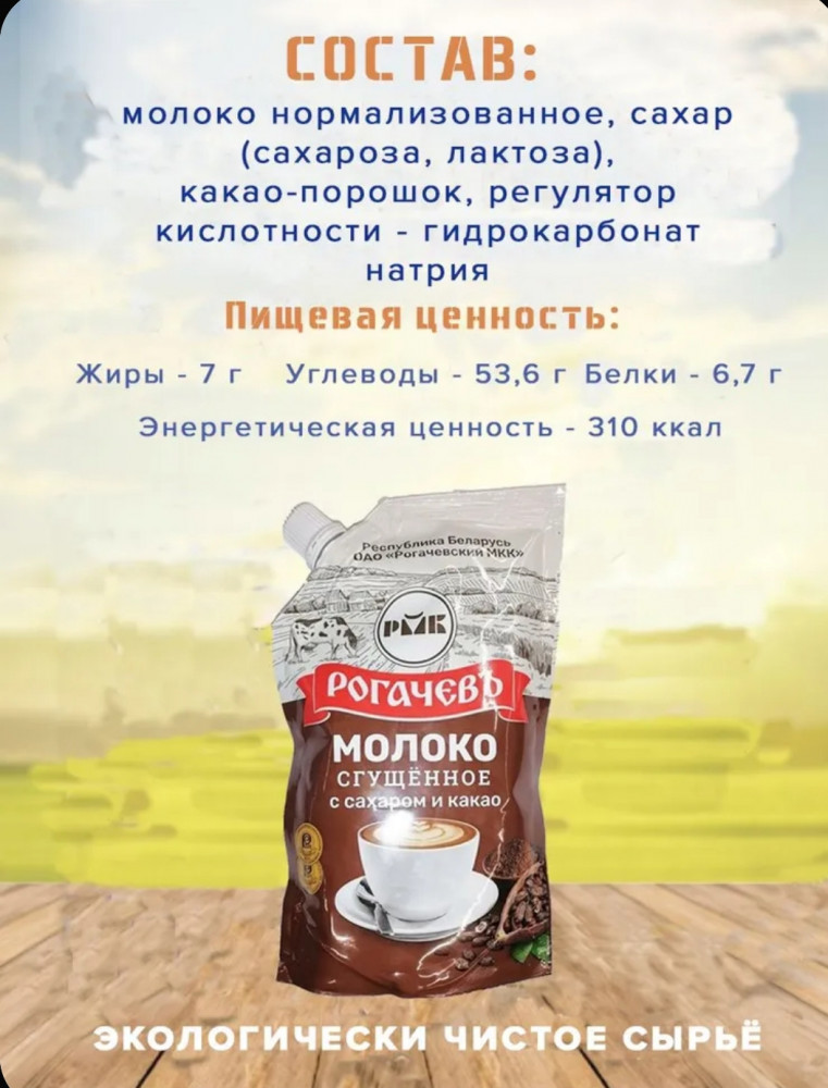 Рогачевский молочно-консервный комбинат представляет вам классическое натуральное сгущённое молоко с сахаром и какао. Оно изготовлено по традиционному советскому рецепту. В его составе только три компонента: натуральное молоко, какао и сахар. Этот продукт обладает ярким сладким вкусом и плотной однородной консистенцией. Сгущёнка от Рогачев очень густая, она тянется и медленно стекает с ложки, создавая неповторимый вкус.