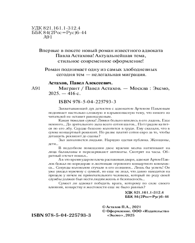 💳 Оплатить за товар можно при получении 🇰🇿 Есть бесплатная доставка по Казахстану 🎁 Копите бонусы с каждой покупки Серия: Астахов. Современный российский детектив (обложка) Какая тяжелая сумка! Лямки больно впились в его ладонь. Еще немного... До зрительного зала всего сотня шагов... Пот градом катится по его лбу. Сердце бешено колотится в груди. Ему сказали, что в сумке концертный реквизит. Но разве платят сотни евро за то, чтобы дотащить реквизит до сцены? Зал заполняется людьми. Нарядно одетая публика. Женщины, дети... В подсобном помещении двое мужчин молча натягивают на лица балаклавы и перезаряжают автоматы. Смотрят на часы. Обратный отсчет пошел... |