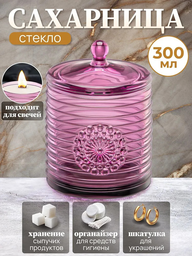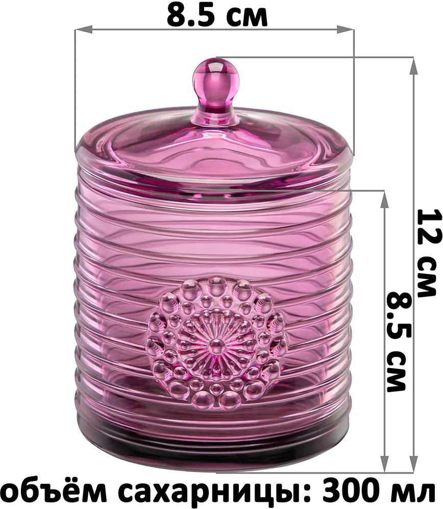Декоративная баночка станет гармоничным дополнением при сервировке вашего стола как в будни, так и на праздник. Красивый дизайн и изысканный розовый цвет позволят использовать её не только для хранения, но и для подачи к столу. Положите в неё конфеты или икру, чтобы удивить гостей изящной сервировкой. Стеклянную ёмкость с крышечкой можно использовать не только как медовый бочонок, икорницу или соусник, но и для специй и приправ. Это позволит держать под рукой всё необходимое во время приготовления и приёма пищи. На даче подойдёт для семейного чаепития в роли медовницы, а также для подачи ягод. В качестве альтернативы красивую вазочку с крышкой можно использовать как шкатулку или органайзер. Сложите в неё украшения, ватные диски или гигиенические палочки. Подходит в роли стакана для свечи.