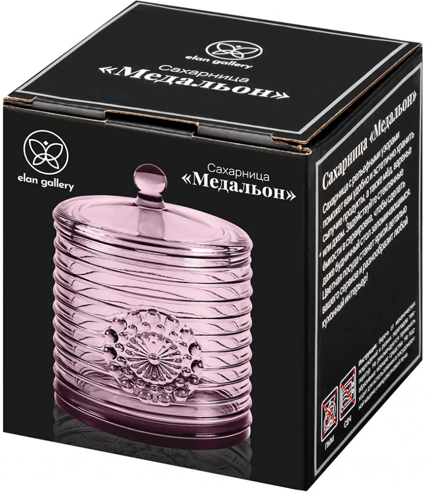 Сахарница Elan Gallery «Медальон» с крышкой выполнена из стекла и украшена декоративным рельефным узором в виде горизонтальных полосок. Стеночку стеклянного изделия украшает выпуклое изображение, напоминающее круглый медальон с декоративными элементами в форме пузырьков. Можно использовать в роли горшочка для мёда. Размер изделия — 8.5×8.5×12 см, объём — 300 мл. Высота без крышки — 8.5 см. Прозрачная баночка с полосатым рельефом подойдёт для хранения мёда, варенья, сахара и соли. Можно использовать её как ёмкость для чая, кофе и других сыпучих продуктов.
