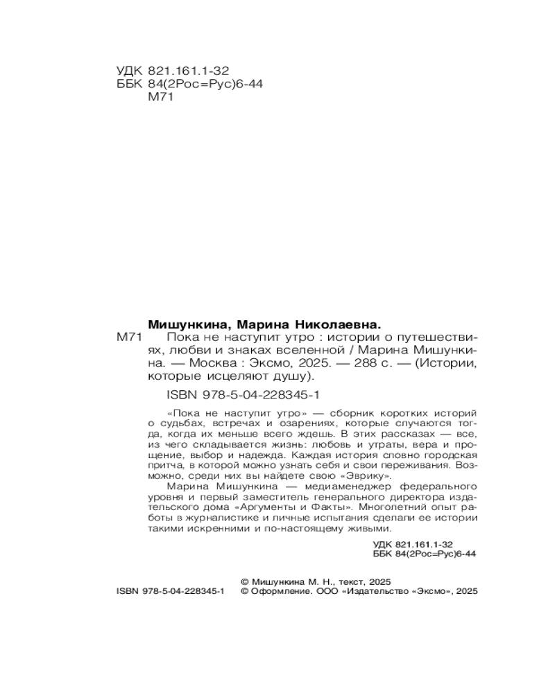💳 Оплатить за товар можно при получении 🇰🇿 Есть бесплатная доставка по Казахстану от 1 дня 🎁 Копите бонусы с каждой покупки Серия: Истории, которые исцеляют душу Женщина узнаёт, что роковой диагноз оказался ошибкой, — и заново учится дышать. Старое письмо с вложенной в него ниточкой превращается в мост между поколениями. Говорящий кот подсказывает хозяйке: пришло время выбрать себя и перестать быть удобной. «Пока не наступит утро» — книга о том, что за городскими историями всегда стоит что-то большее: урок, озарение, подсказка. Каждая глава как современная притча, которую можно примерить к собственной жизни. Здесь собраны рассказы о путешествиях и неожиданных встречах, о любви, родителях и детях, о вере, предательстве и прощении, о чудесах, которые случаются тогда, когда их меньше всего ждешь. Возможно, среди этих историй вы найдете свою «Эврика». |