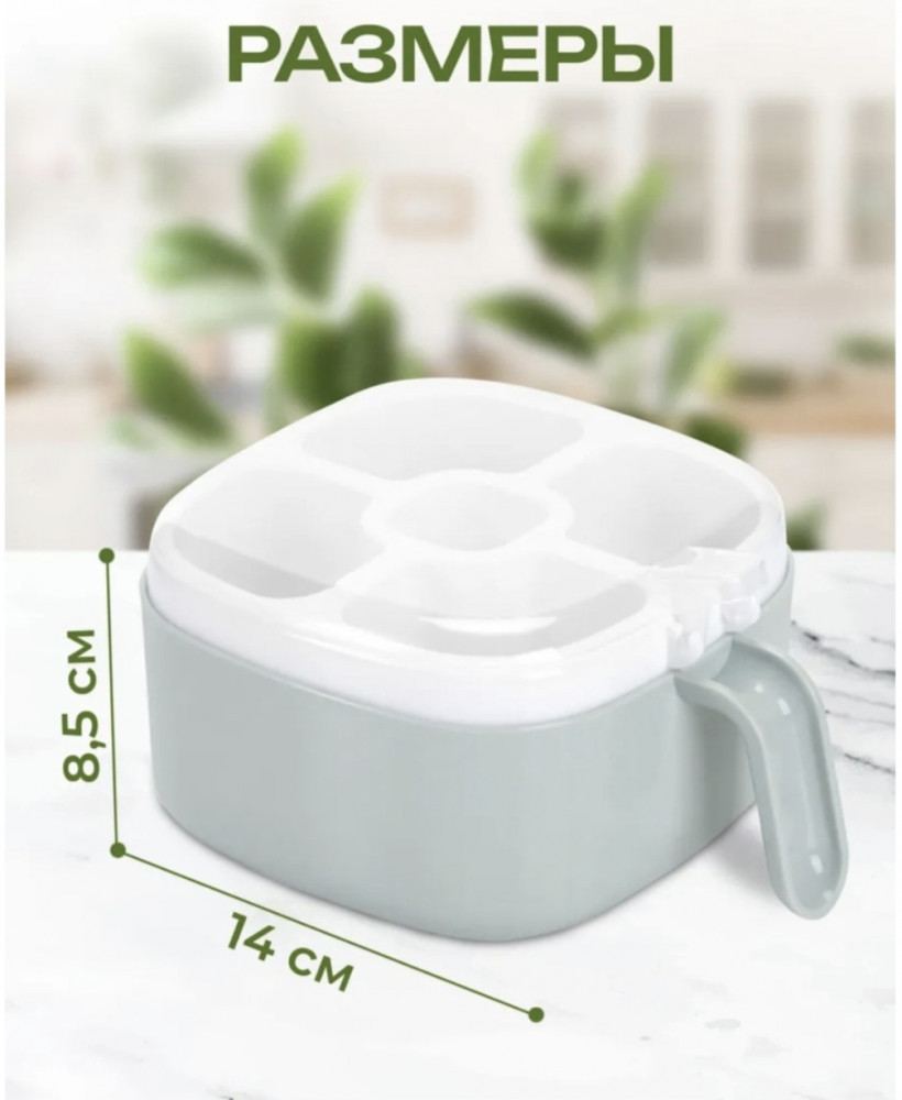 💳 Оплатить за товар можно при получении 🇰🇿 Есть бесплатная доставка по Казахстану от 1 дня 🎁 Копите бонусы с каждой покупки Контейнер-органайзер для хранения специй с отсеками — идеальное решение для хранения любых сыпучих продуктов на вашей кухне. Крышка удобно и легко открывается, что ускоряет процесс приготовления пищи. Набор имеет 4 вместительных отсека и 4 удобные ложки в комплекте для дозирования сыпучих продуктов. Контейнер полностью крепкий, что позволяет удобно мыть в посудомоечной машине. |